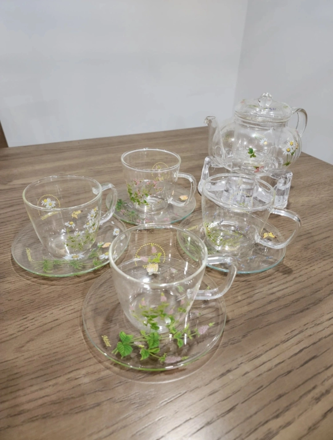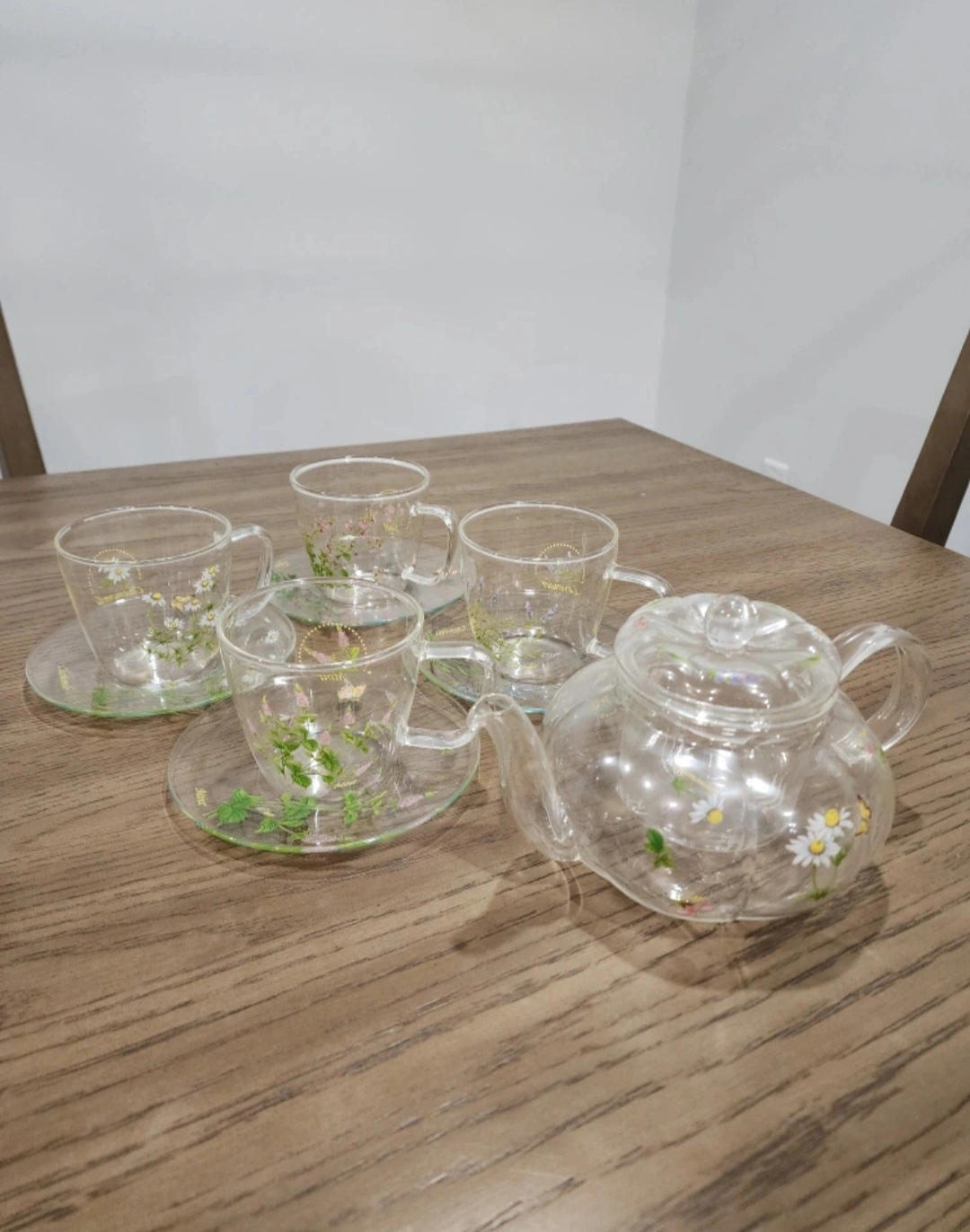 Selling a charming glass tea set! It includes a teapot with a floral design and matching cups and saucers. Perfect for adding a touch of elegance to your tea time