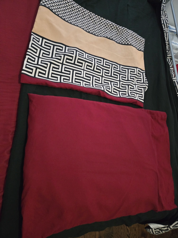 Double size bedding set with a unique geometric pattern and colour combination of red, black, and beige ✨️