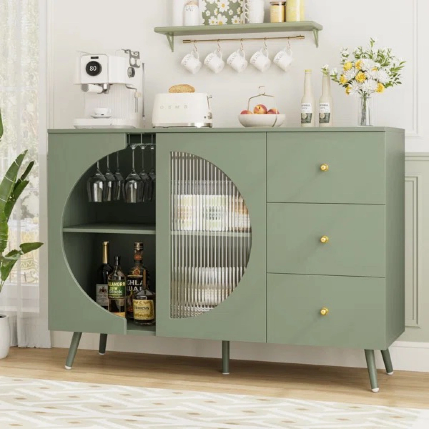 This stylish green accent cabinet offers a blend of functionality and modern design. It features a unique circular cutout with shelving, perfect for displaying your favorite items, and a reeded glass door that adds a touch of elegance. With drawers and additional storage space, it's ideal for organizing your living area or dining room. It's a great piece to enhance your home decor!