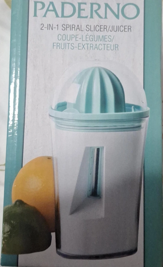 I'm selling a brand new Paderno 2-in-1 Spiral Slicer/Juicer. It's perfect for squeezing your favourite juices and cutting fruit into spirals for salads, stir-fries, and more. Plus, it's dishwasher safe on the top rack! The box is included.