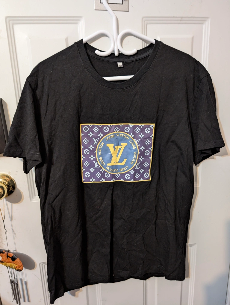 Selling a black Louis Vuitton t-shirt. It features the classic LV logo on the front. A stylish addition to any wardrobe!