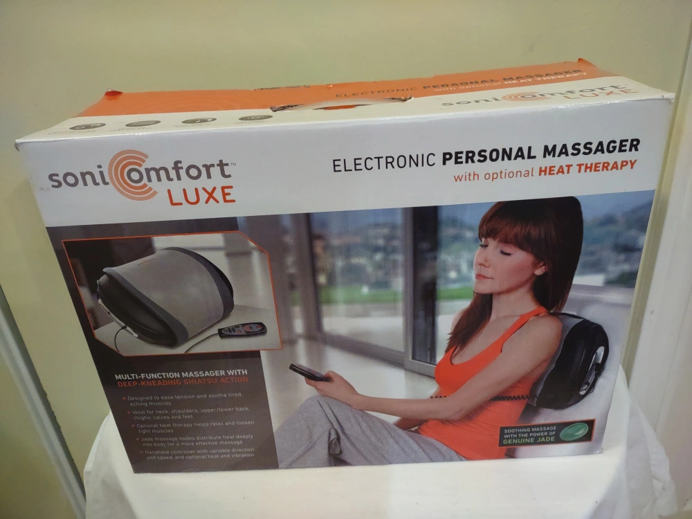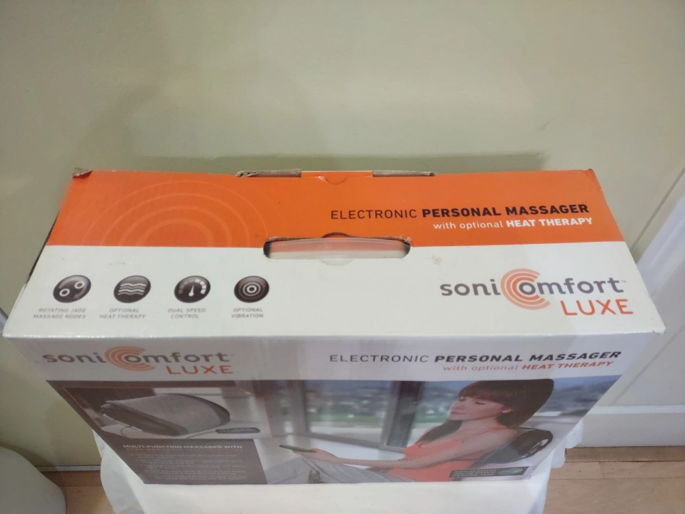 Selling a SoniComfort Luxe electronic personal massager. It comes with optional heat therapy and is designed to ease tension and soothe tired, aching muscles. It features rotating jade massage nodes and dual speed control with optional vibration. The box is included!