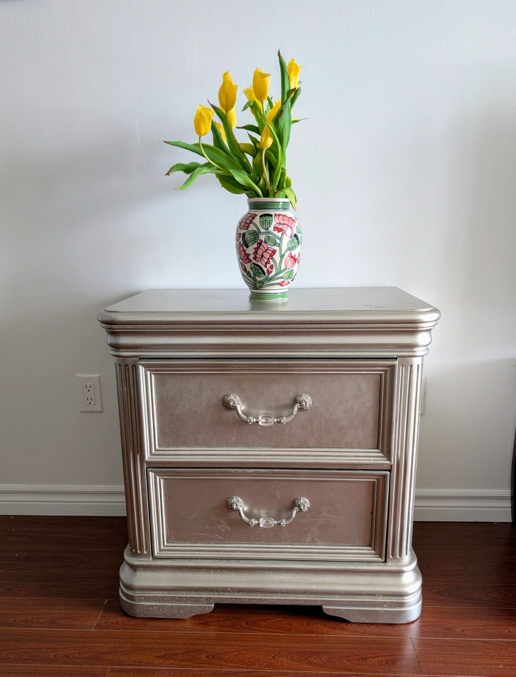 430Elegant end table/ nightstand. Silver-gold vintage finish. Can be used as a dresser too. Features crystal drawer pulls. Great for bedroom or living room. Solid wood construction with 2 deep drawers (almost like new). Retails for $299.99 + tax NOTE: Check my other listings and buy in a bundle for Discounts. Pickup at Rees and Queens Quay W