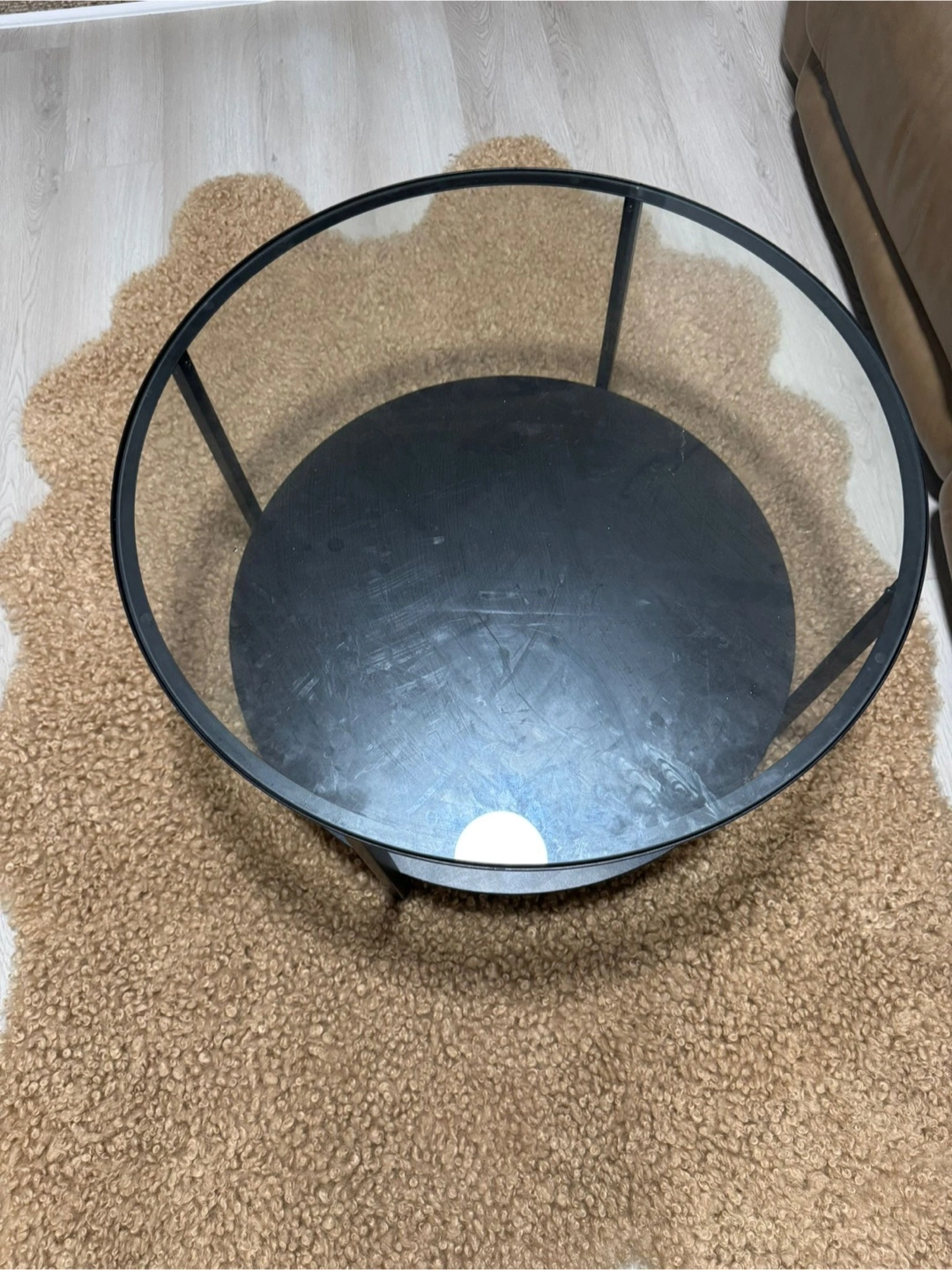 Selling a round coffee table with a sleek black frame and a glass top! It also has a bottom shelf for extra storage or decor. It's in great condition and would look lovely in any living room