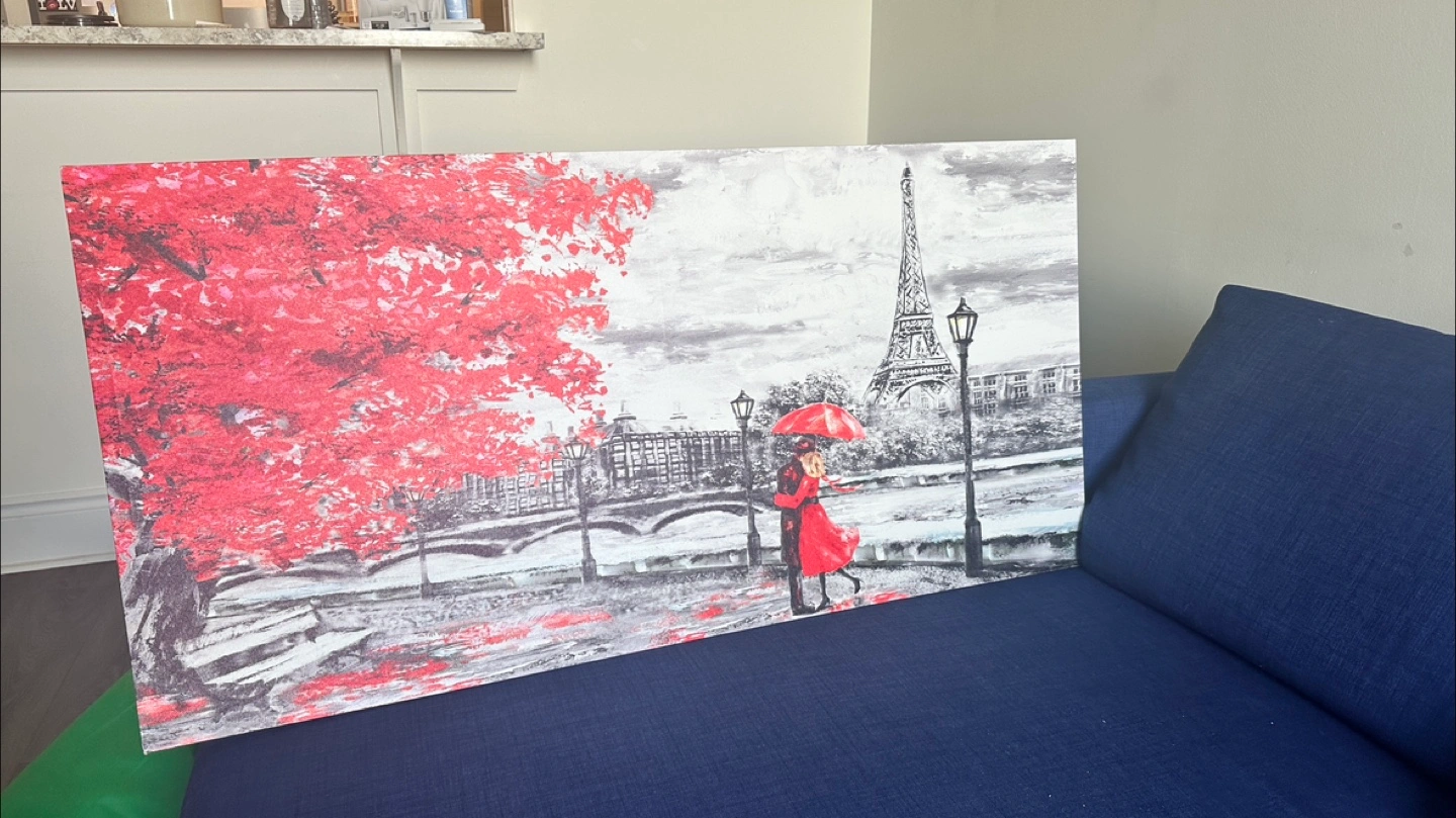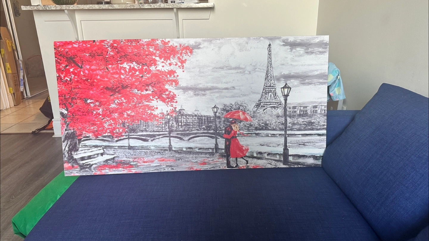 Paris Eiffel Tower Canvas Wall art! The artwork has vibrant red accents against a black and white background, making it a lovely addition to your living room. Dimension: 48 * 24 inch Address: 700 Humberwood Blvd, Etobicoke