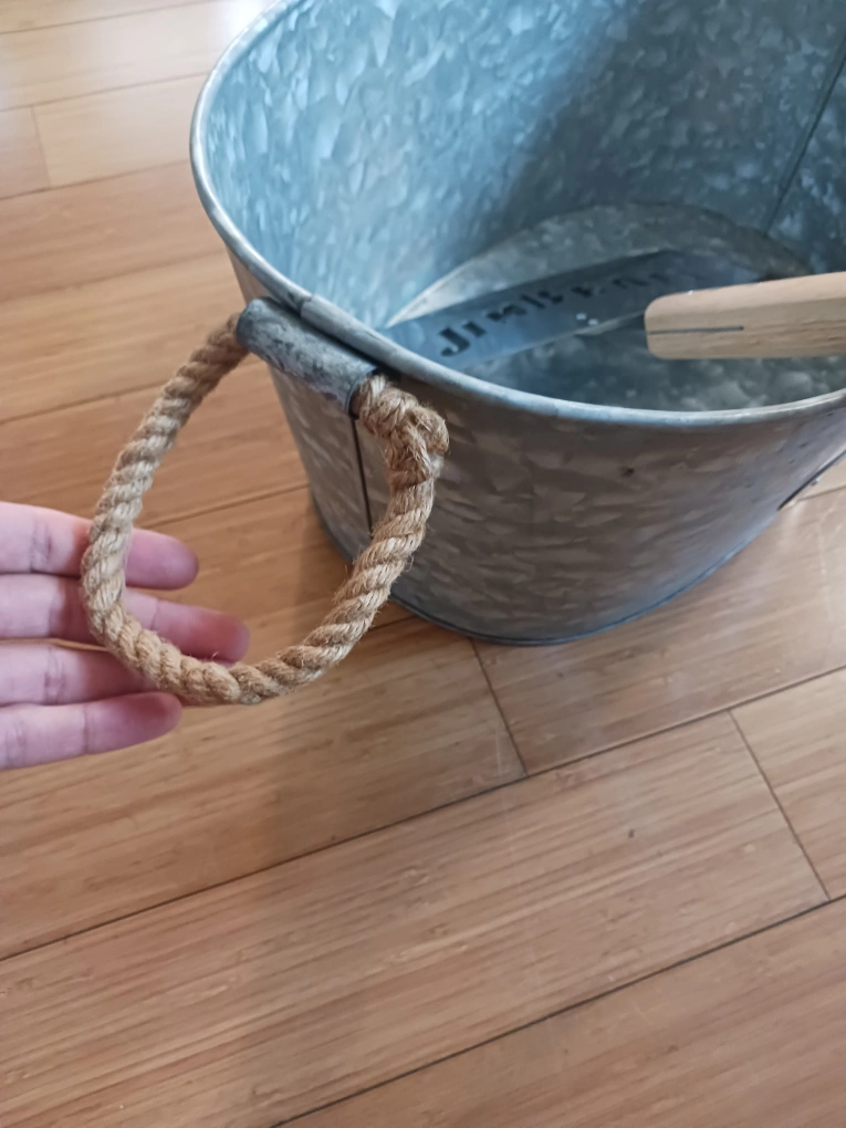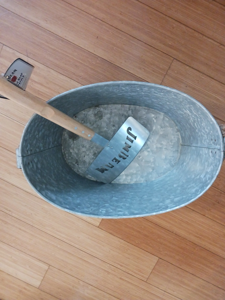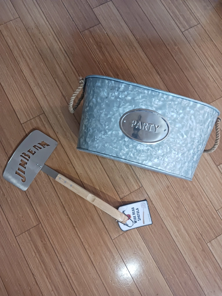 I'm selling a Jim Beam wide head spatula. It has a wooden handle and a metal spatula head with the Jim Beam logo cut out. It also comes with a Cynthian Rowley metal bucket with rope handles that has 'Party' written on the front.