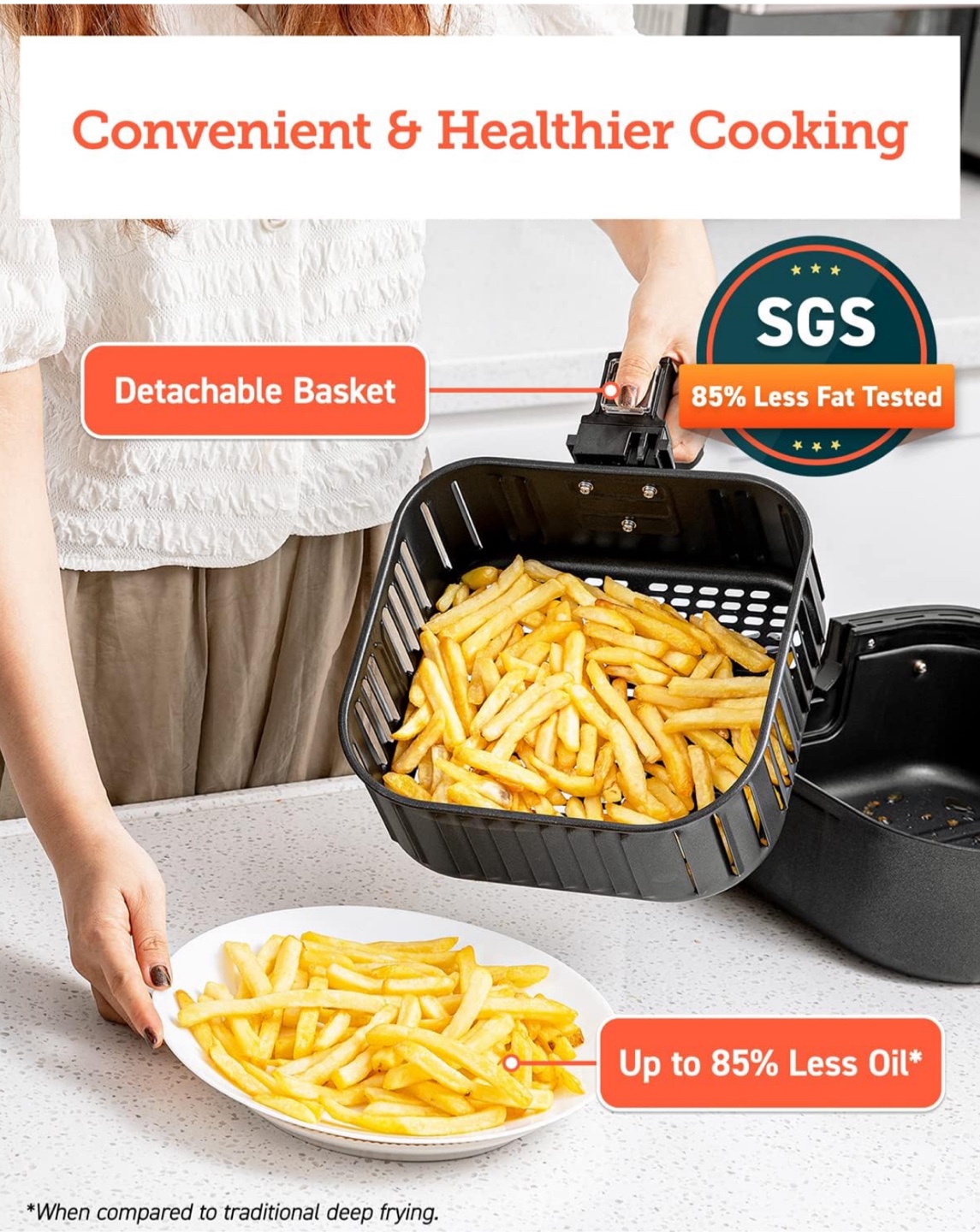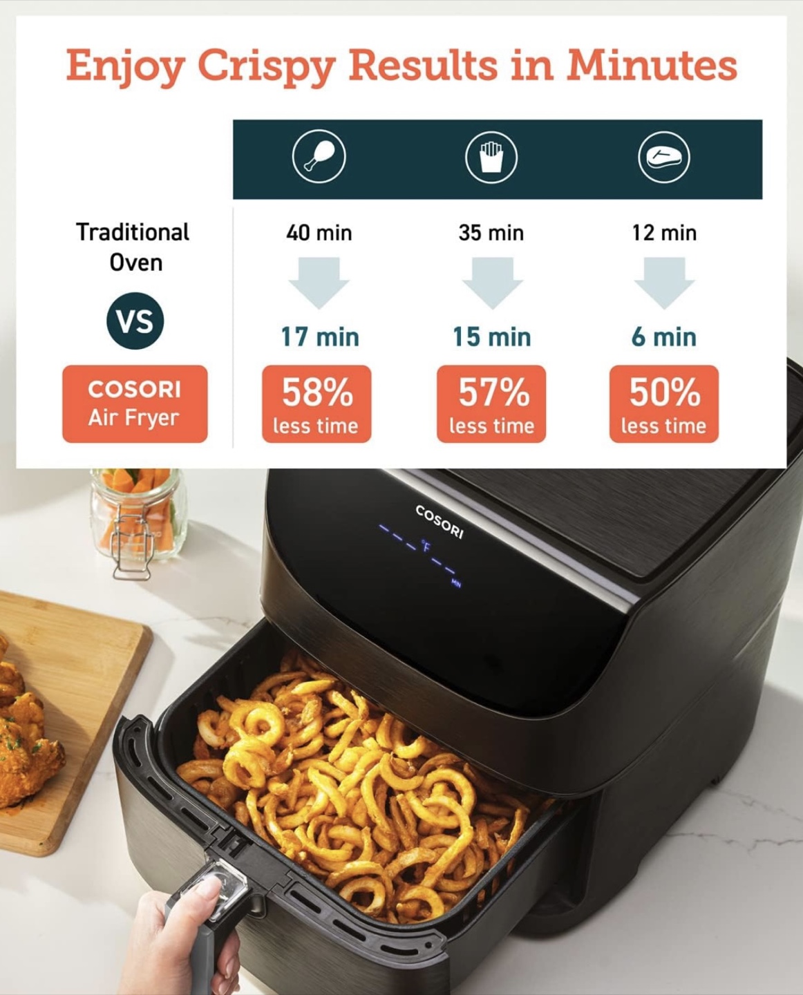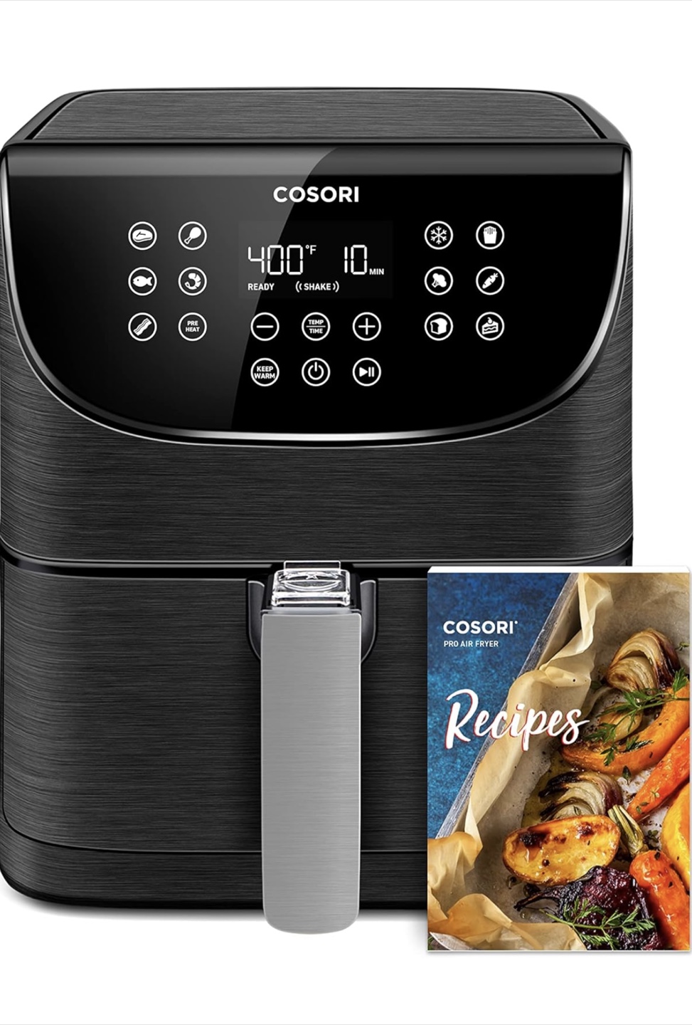 Enjoy crispy results in minutes with this Cosori Pro Air Fryer! It offers convenient and healthier cooking with up to 85% less oil. The detachable basket makes for easy cleaning. Compared to a traditional oven, it cooks food faster, saving you time and energy. It also comes with a recipe book to get you started!