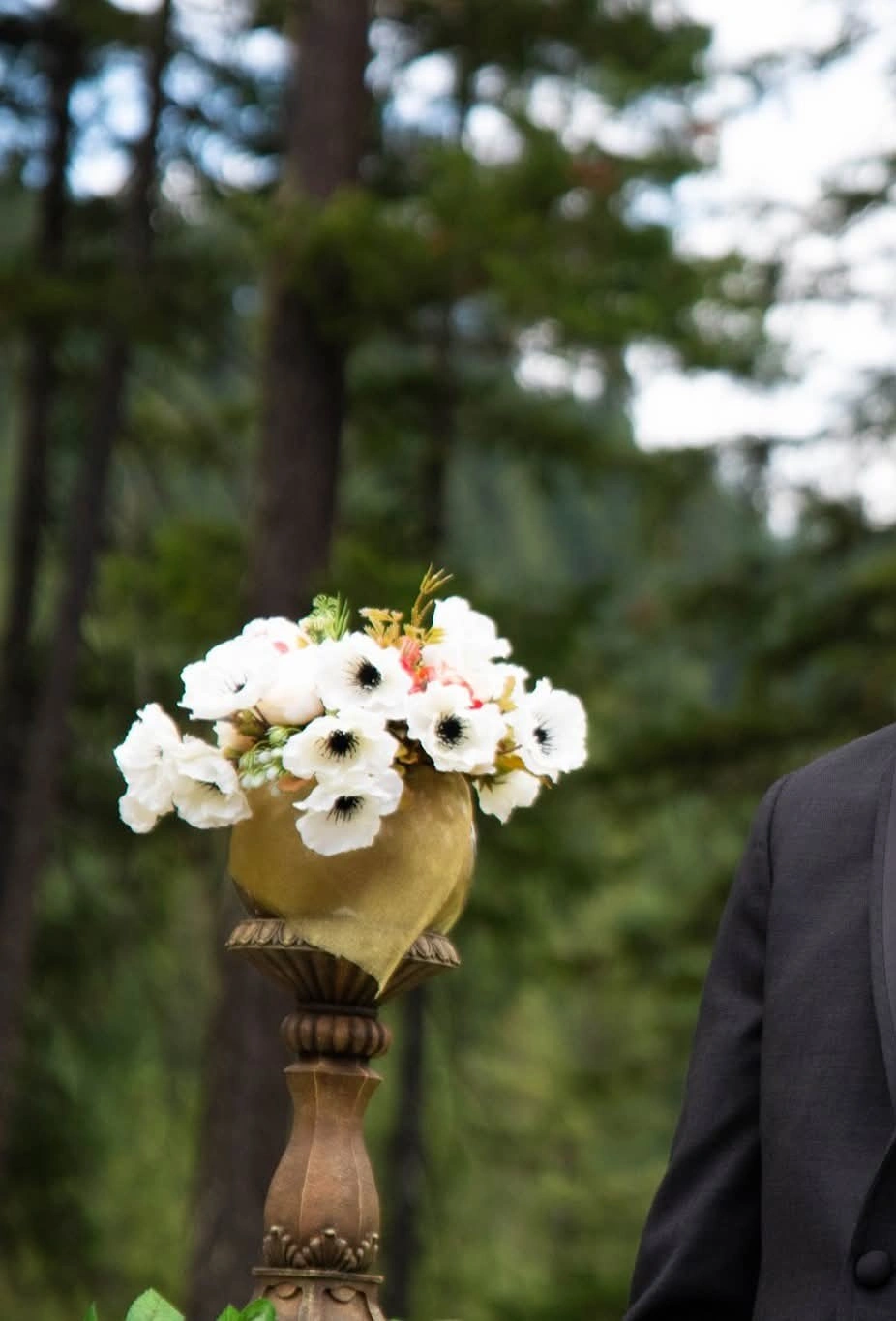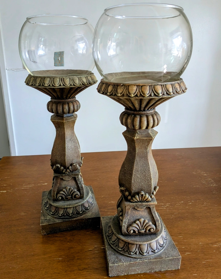 Pair of baroque candle holders, very heavy base. I used them for bouquets at a wedding. They're 16.5" tall, 5" square base, and a 4.5" opening on the glass bowl.