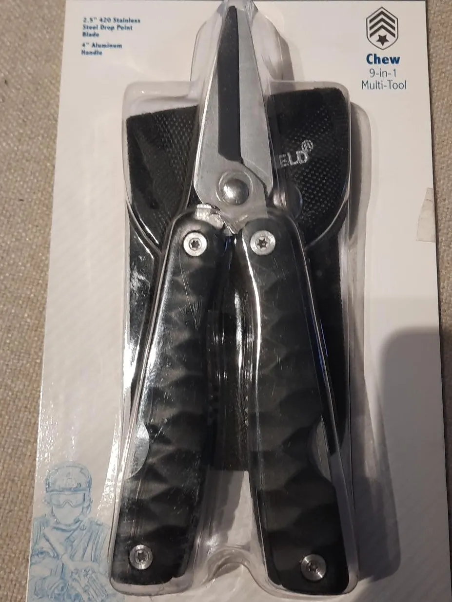 Selling a Sheffield Chew 9-in-1 Multi-Tool! It features a 2.5" 420 stainless steel drop point blade and a 4" aluminum handle. This handy tool includes scissors, a saw, a small screwdriver, a mini slotted screwdriver, a can opener, a bottle opener, a Phillips screwdriver, and a large slotted screwdriver. It also comes with a 1680D sheath for safekeeping