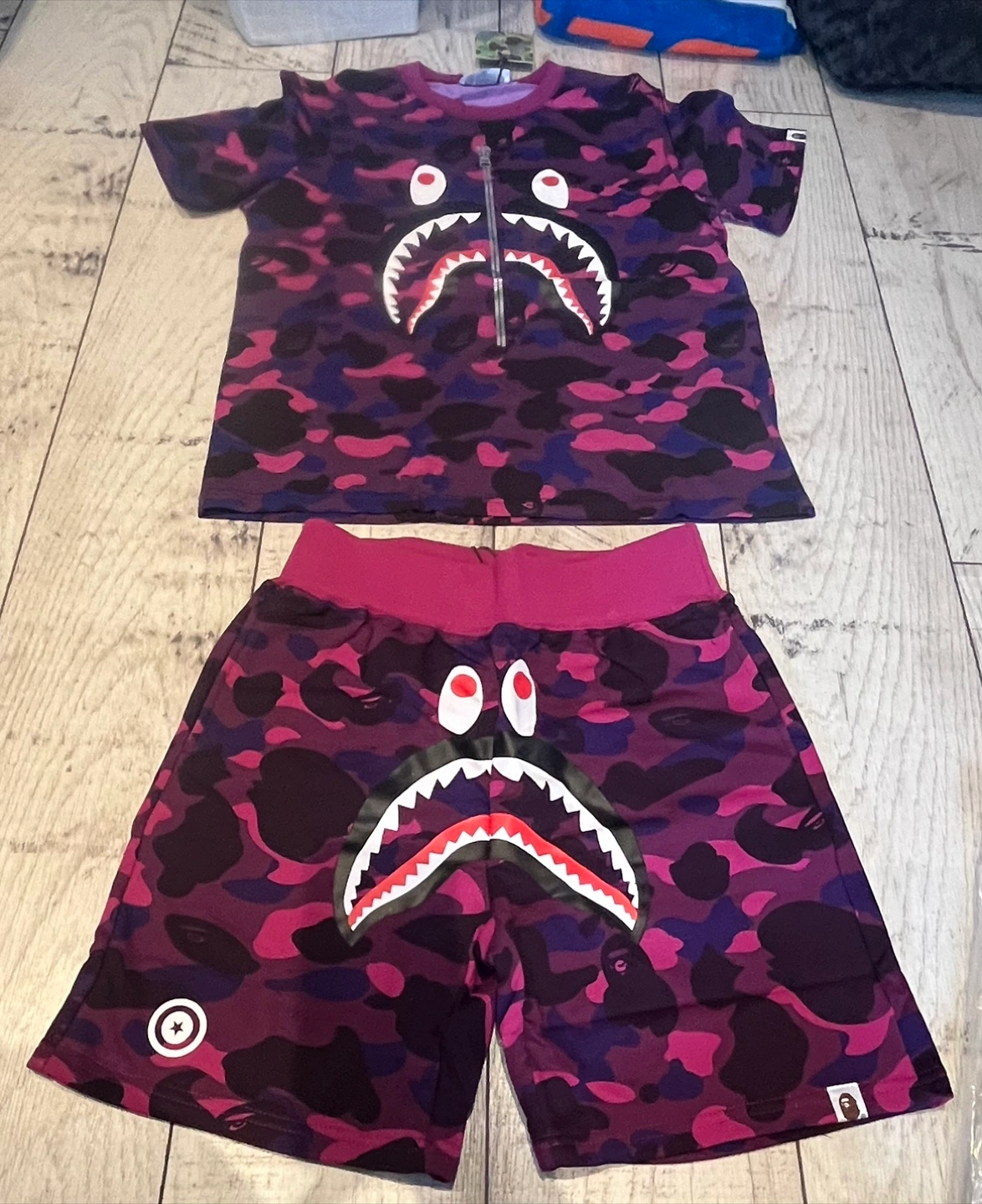 BAPE shark purple shirt and shorts