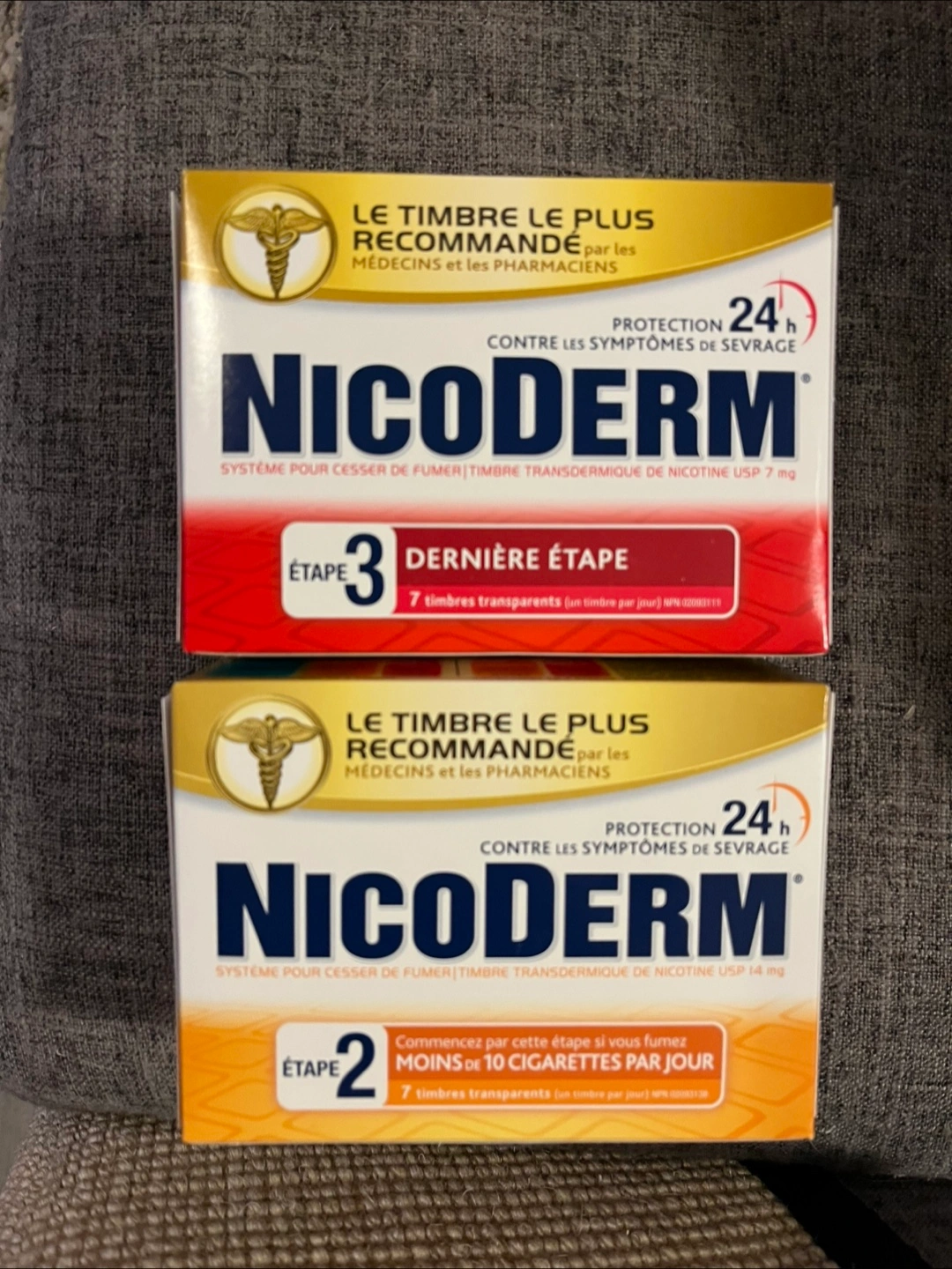 8 boxes of Nicoderm patches to help you quit smoking. 4 boxes are Step 3 (7mg) and the others are Step 2 (14mg). Each box contains 7 transparent patches.