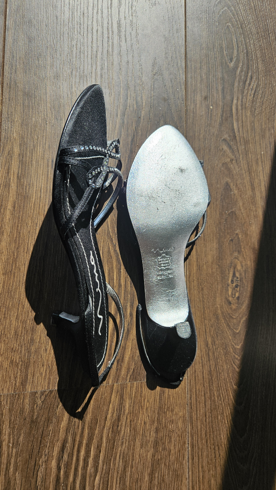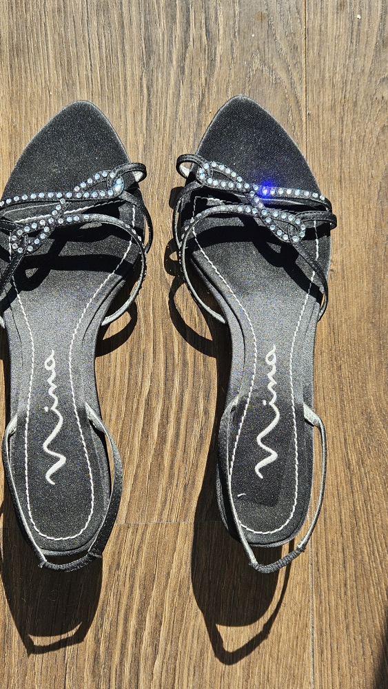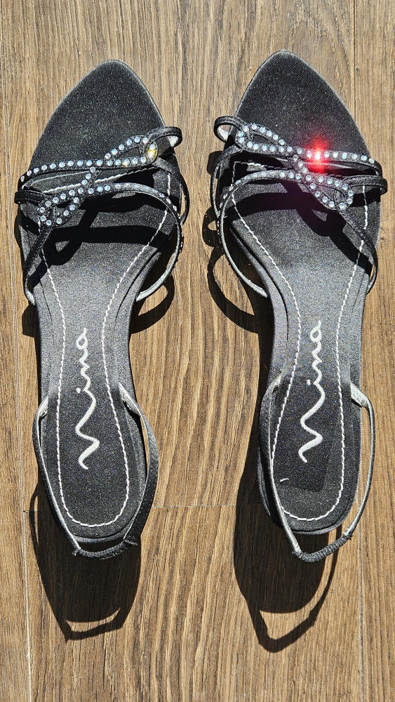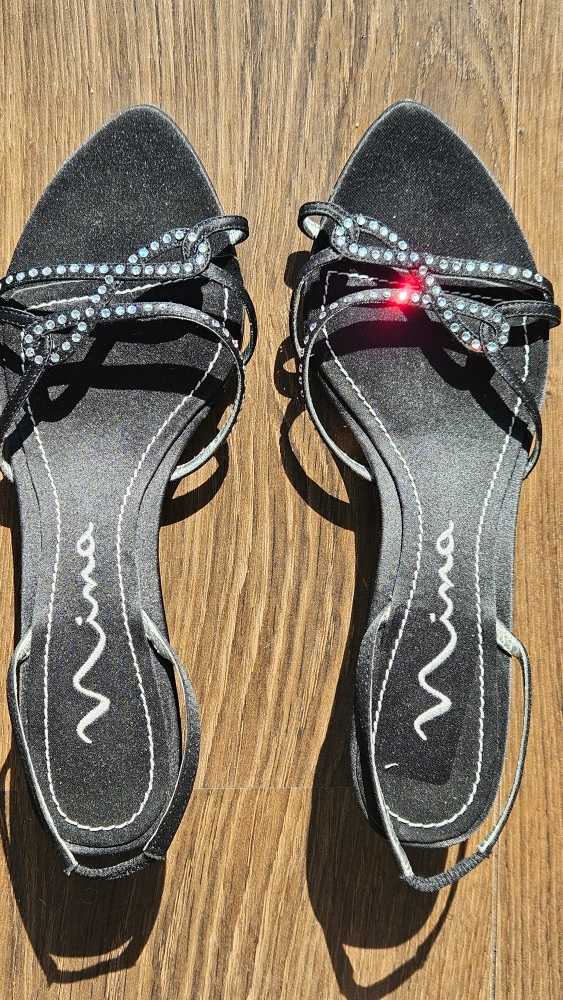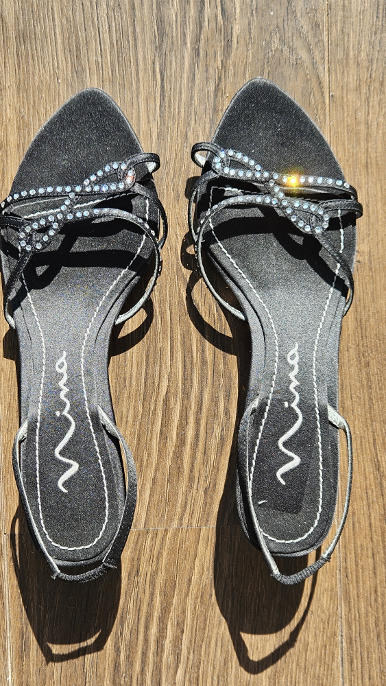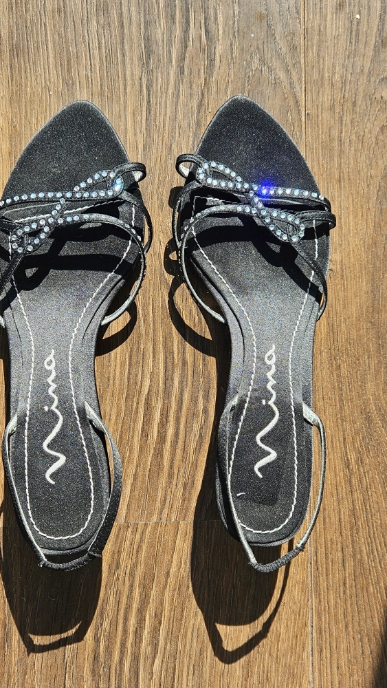 These elegant Nina heels are perfect for a night out! They're black with delicate embellishments - real crystals, and the size is 8 (USA). The sole is genuine leather.
