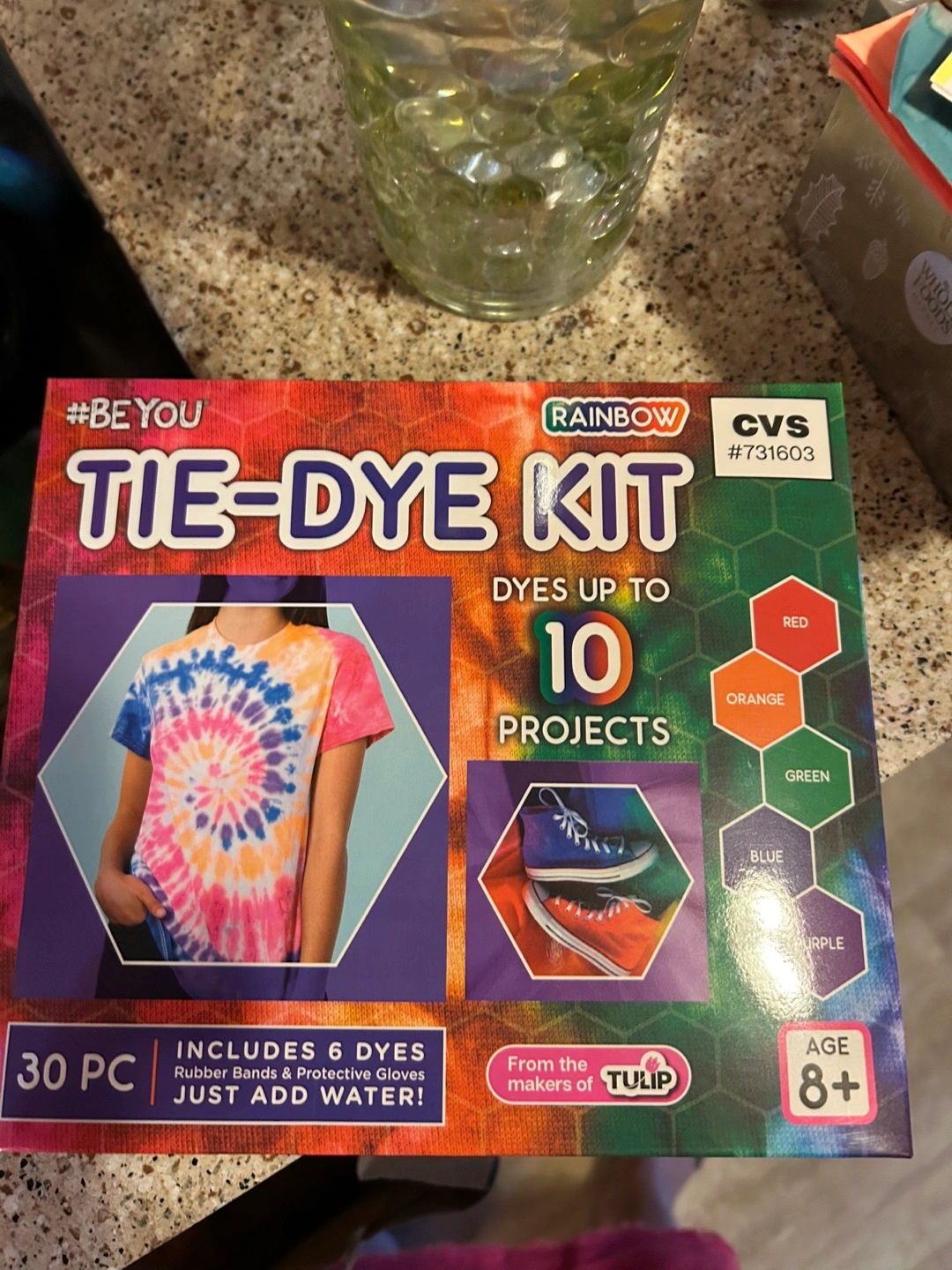 Get ready to unleash your creativity with this #BeYou Rainbow Tie-Dye Kit! Perfect for ages 8 and up, this kit includes everything you need to dye up to 10 projects. The kit includes 5 squeeze bottles containing dye (Red, Blue, Green, Purple, Orange), 1 dye refill Blue, 2 pairs of protective gloves, and 20 rubber bands. It's a 30-piece set that includes 6 dyes, rubber bands and protective gloves - just add water!