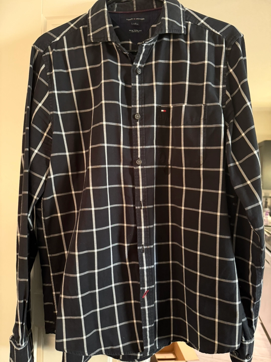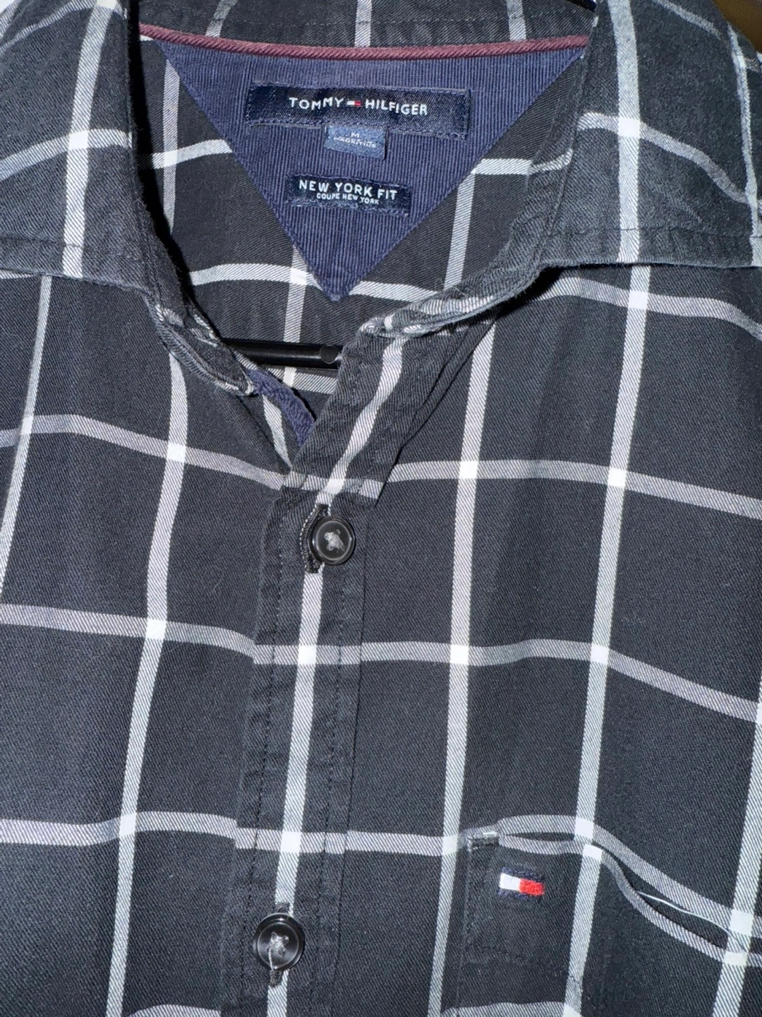 Looking to pass along this Tommy Hilfiger button-up shirt! It's a size M and has a nice black and white plaid pattern. The shirt is in great shape and ready for a new home!