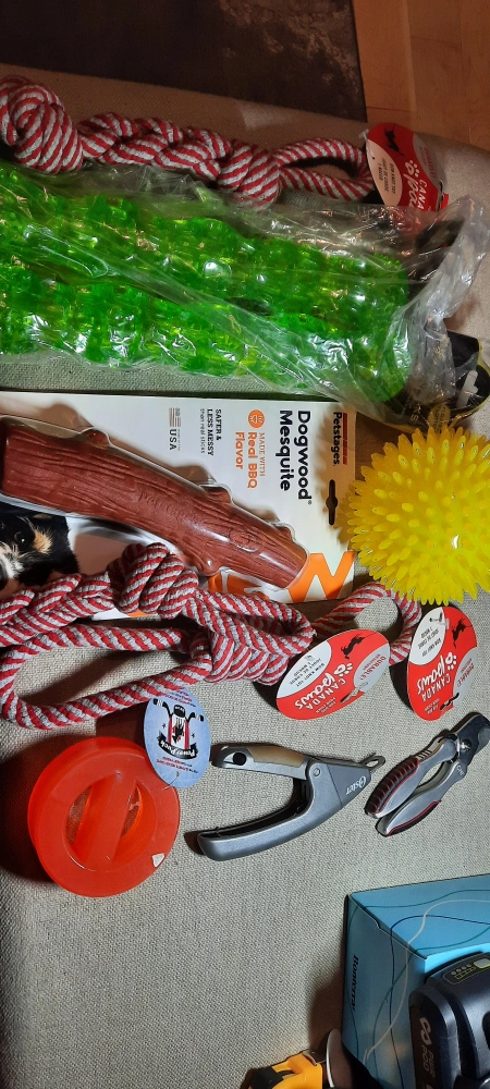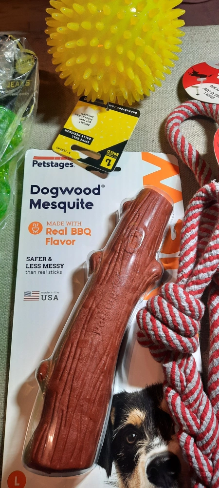 - Dogwood Mesquite BBQ flavour chew toy (safer & less messy than real sticks)