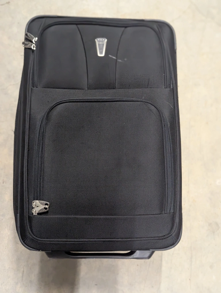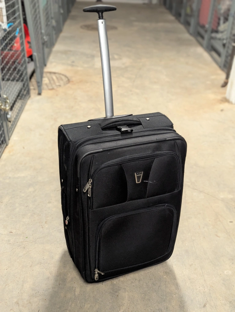 Selling a Travelpro rolling suitcase in black. It's a carry-on size and has a retractable handle. There are some signs of wear on the wheels and exterior, but it's still in good working condition and ready for your next trip!