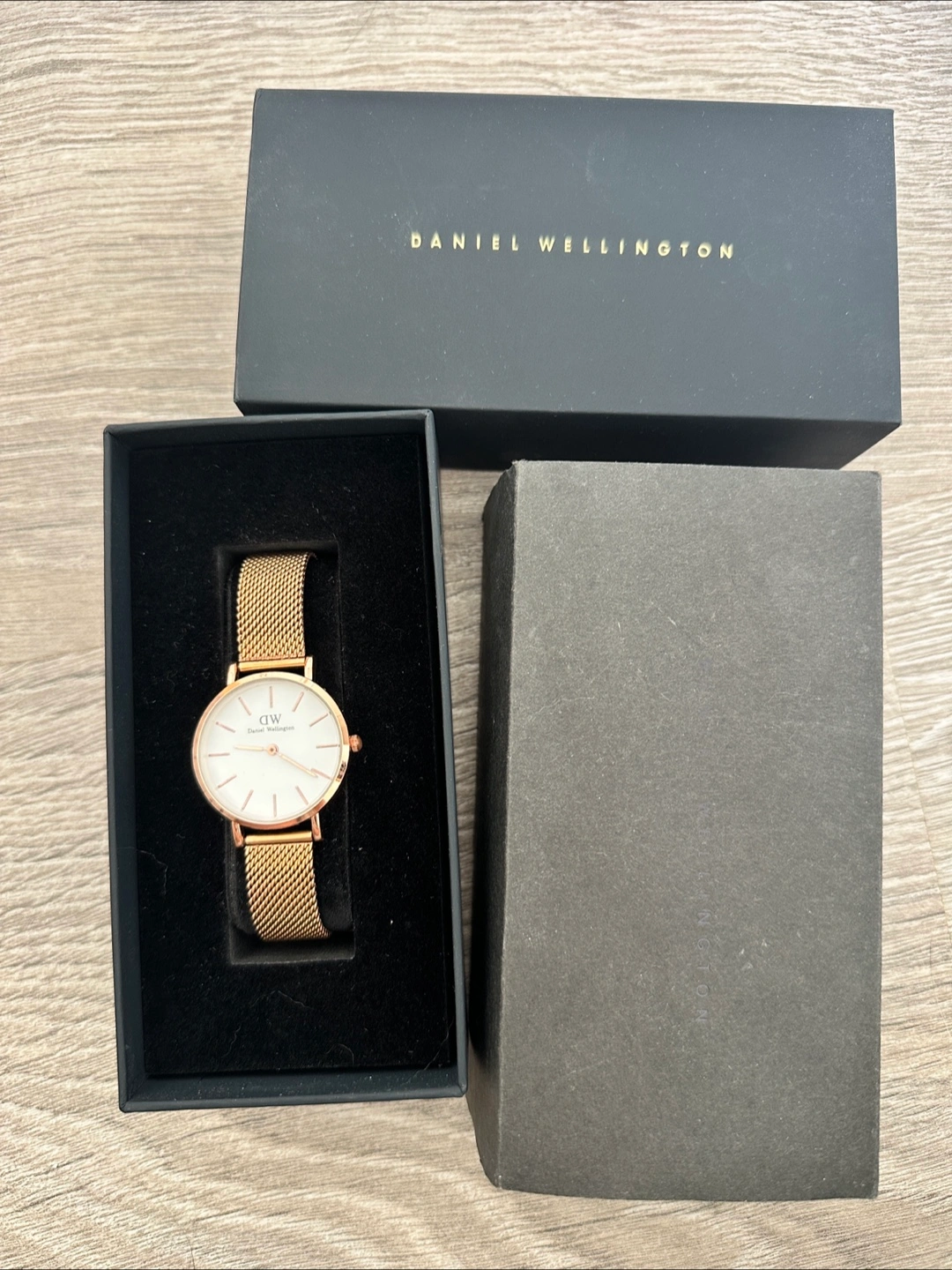 Selling a Daniel Wellington Ladies Petite 28mm watch in rose gold. It comes with the original box. Originally bought for $245