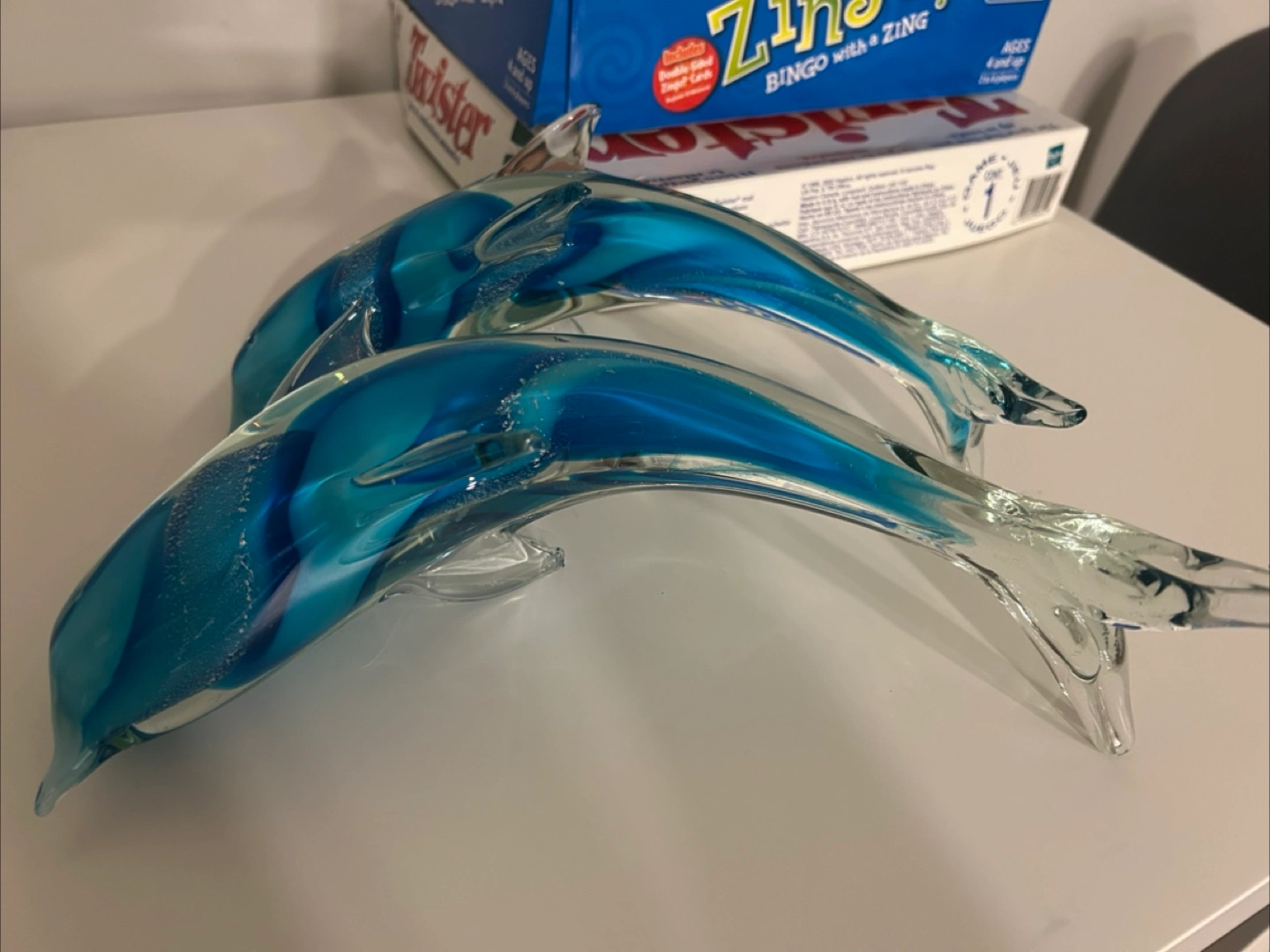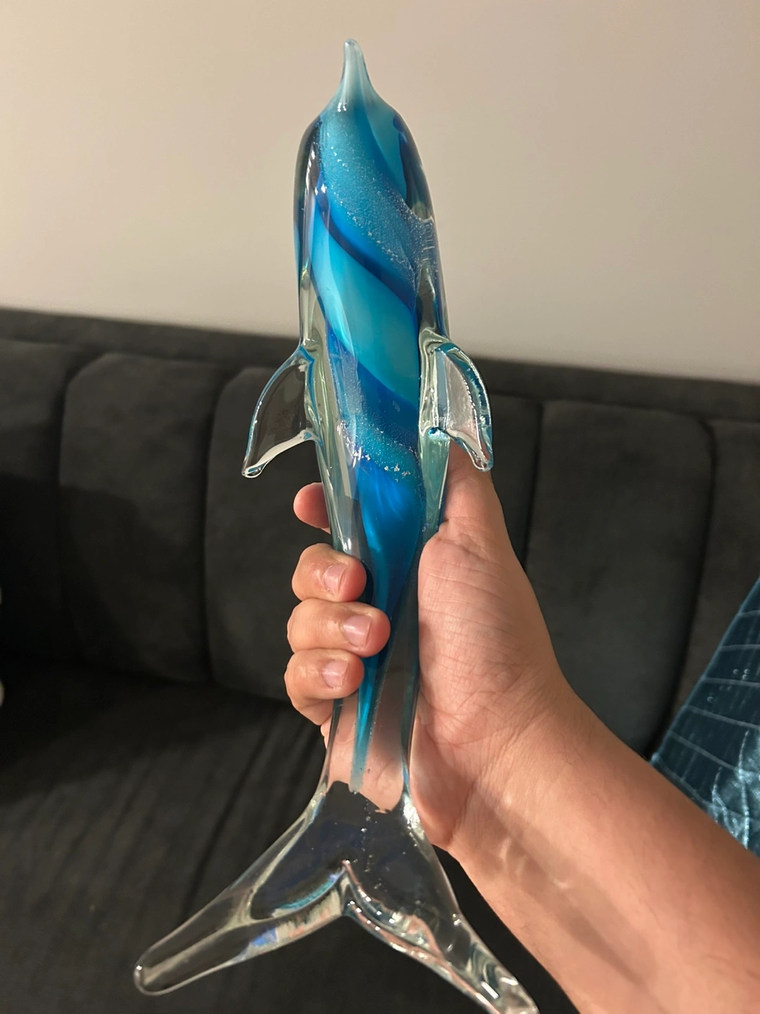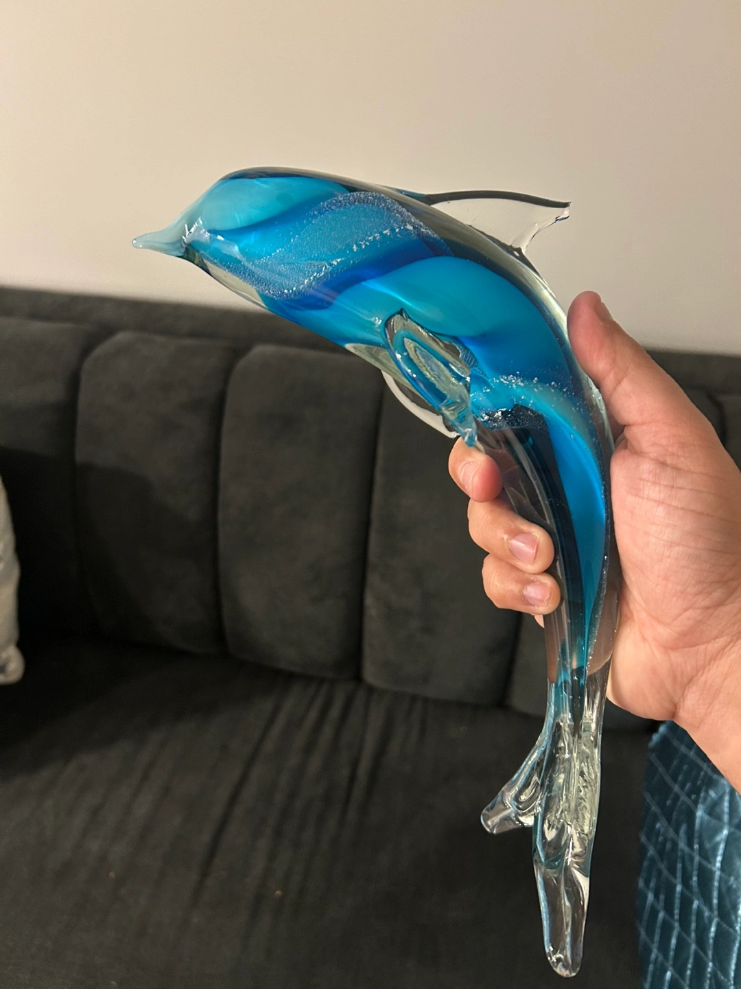 Selling a beautiful blue glass dolphin figurine! It would look great as a decorative piece in your home. The glass has swirls of blue and clear, with a bit of silver shimmer inside. It's in great condition and ready for a new home!