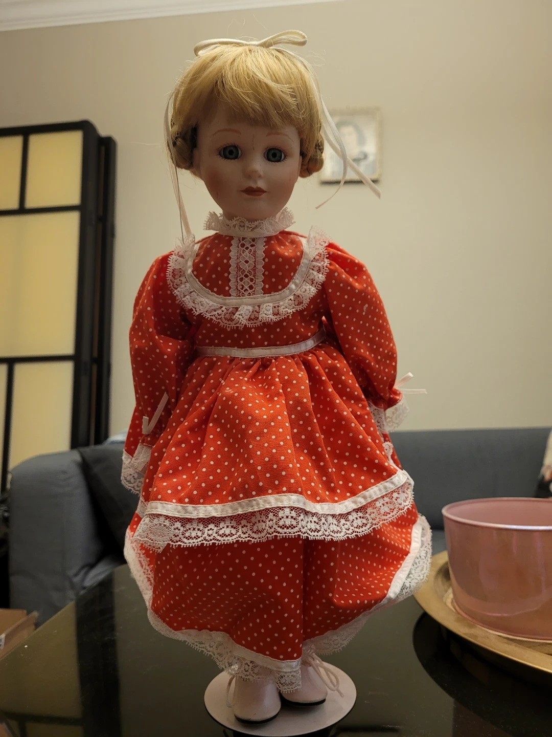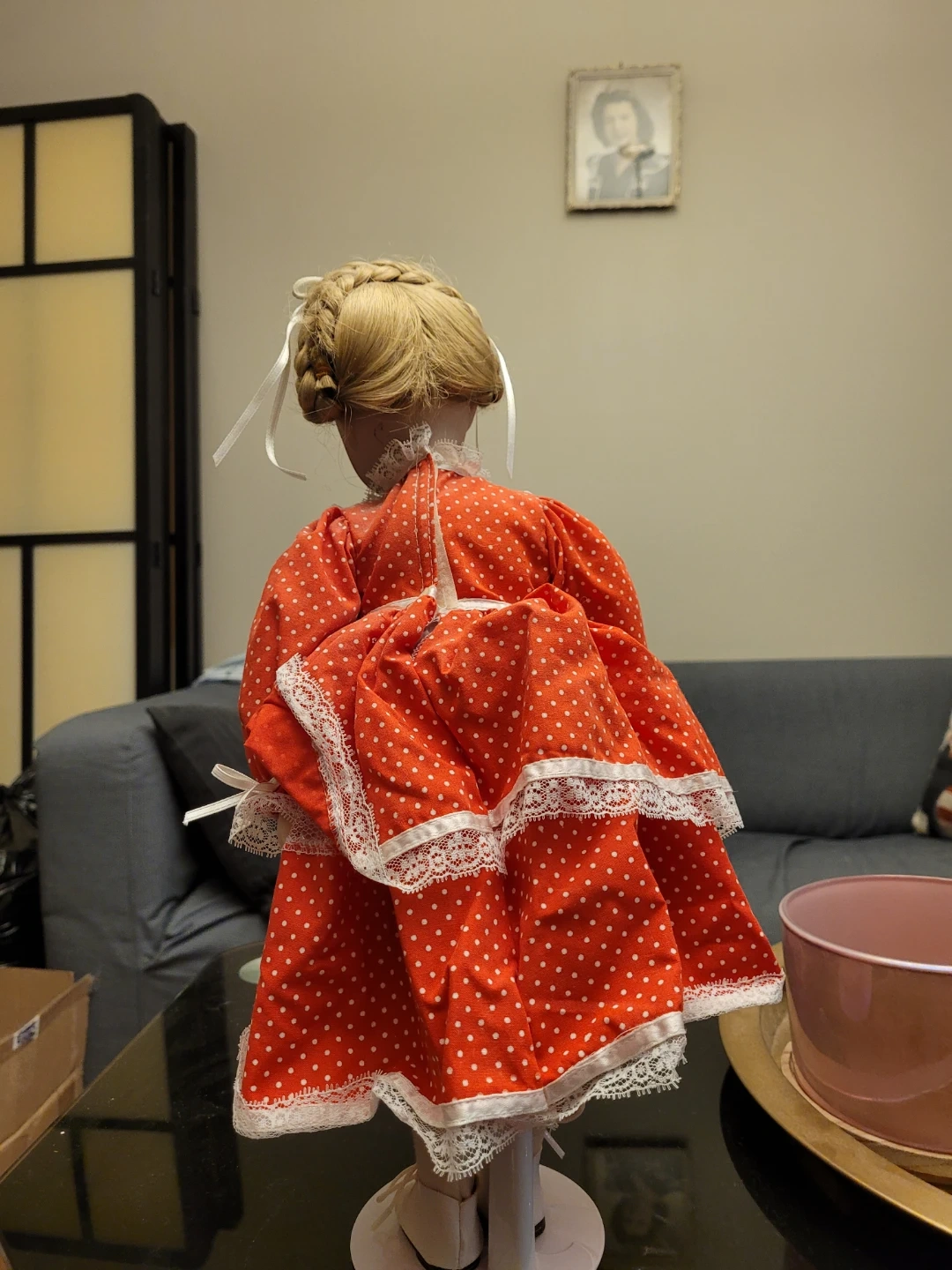 A beautiful porcelain doll dressed in a charming red polka dot dress with white lace trim. The doll has blonde hair styled in braids and comes with a stand for display. It's in great condition and would make a lovely addition to any collection or a sweet gift for a doll enthusiast. Lightly dusty from being in storage.