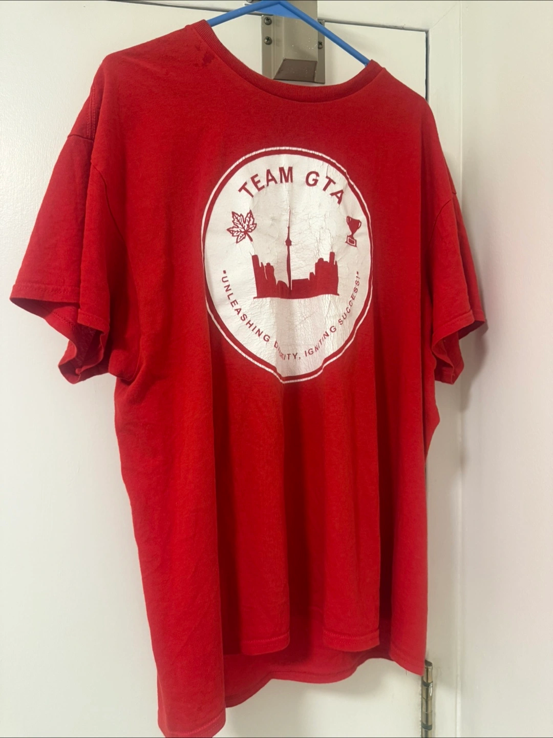A vibrant red Team GTA t-shirt, perfect for showing your Toronto pride! It features a cool design with the Toronto skyline and a maple leaf. A great way to represent the city! It has signs of wear but still wearable