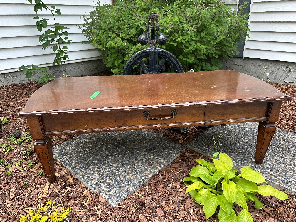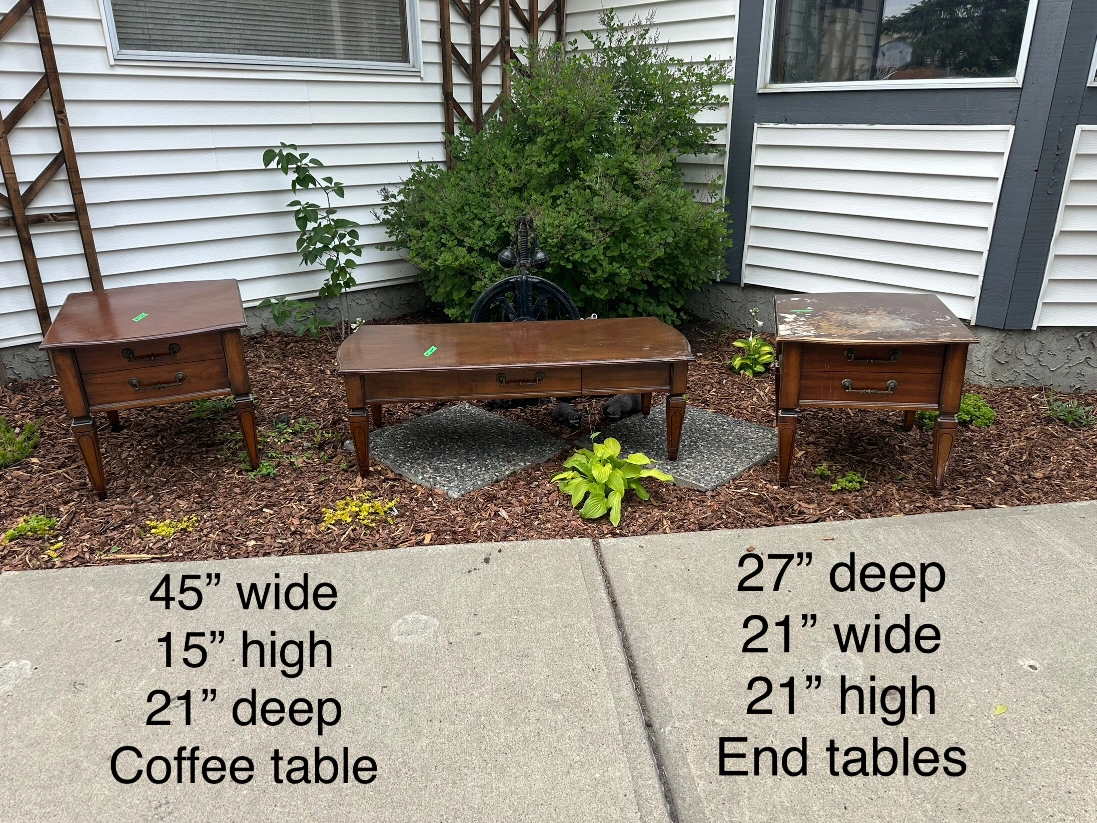 Selling a set of vintage brown wood coffee and end tables. All 3 could use a coat of paint. They would make a beautiful addition to any living room!