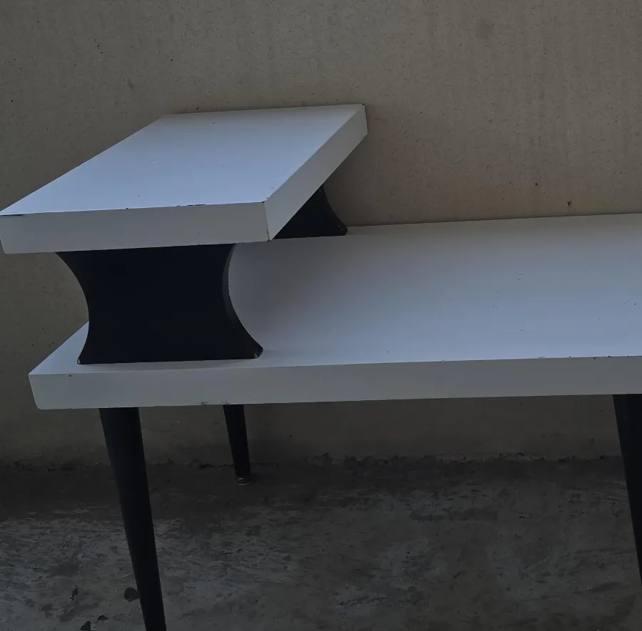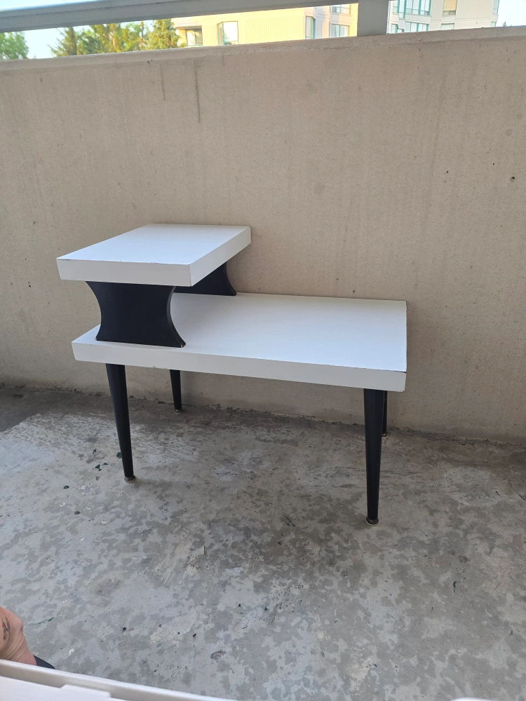 Selling a stylish side table with a unique design! It features a two-tiered surface in white, supported by sleek black legs and a black curved support. Perfect for adding a touch of modern flair to any room