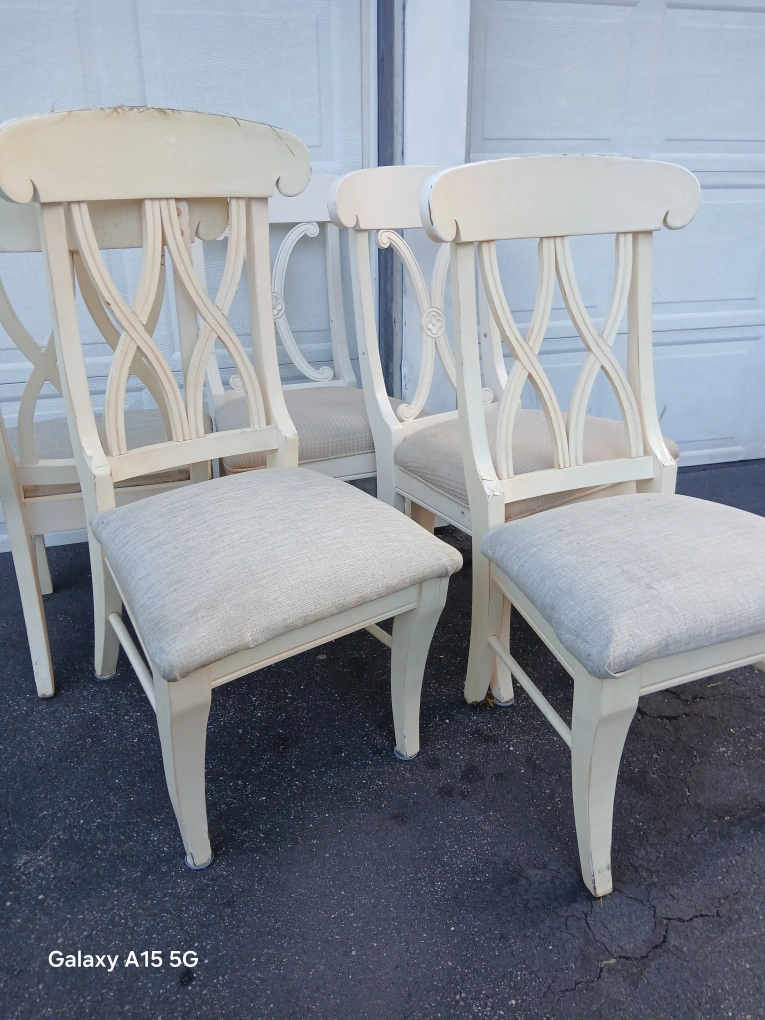 Selling a set of four vintage dining chairs. They have a classic design with a cream-colored finish and neutral-toned fabric seats. Perfect for adding a touch of elegance to your dining space!