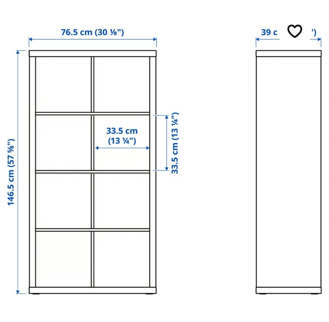 Selling a white IKEA Kallax shelf unit. It features an 8-cube design, perfect for storage or display. The dimensions are 146.5 cm (57 5/8") in height, 76.5 cm (30 1/8") in width, and 39 cm in depth. It's in great shape and ready for a new home!