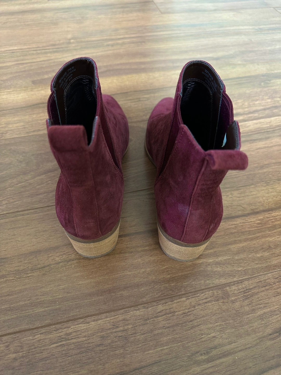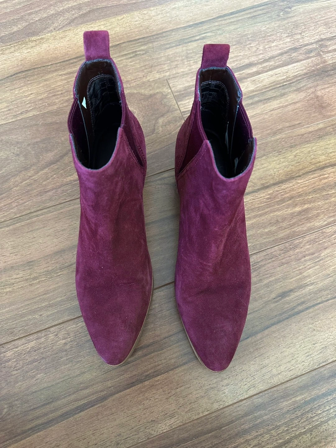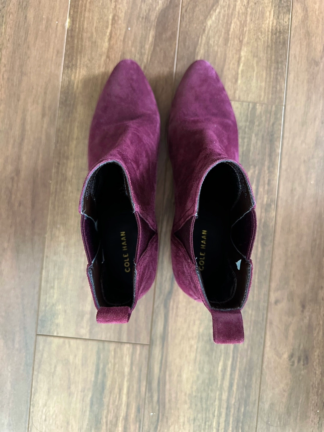 Brand new, never been worn (without box) Cole Haan women's suede Marinne Ankle Bootie in colour "wine tasting". Size 7.5. Colour most resembles the stock photos!