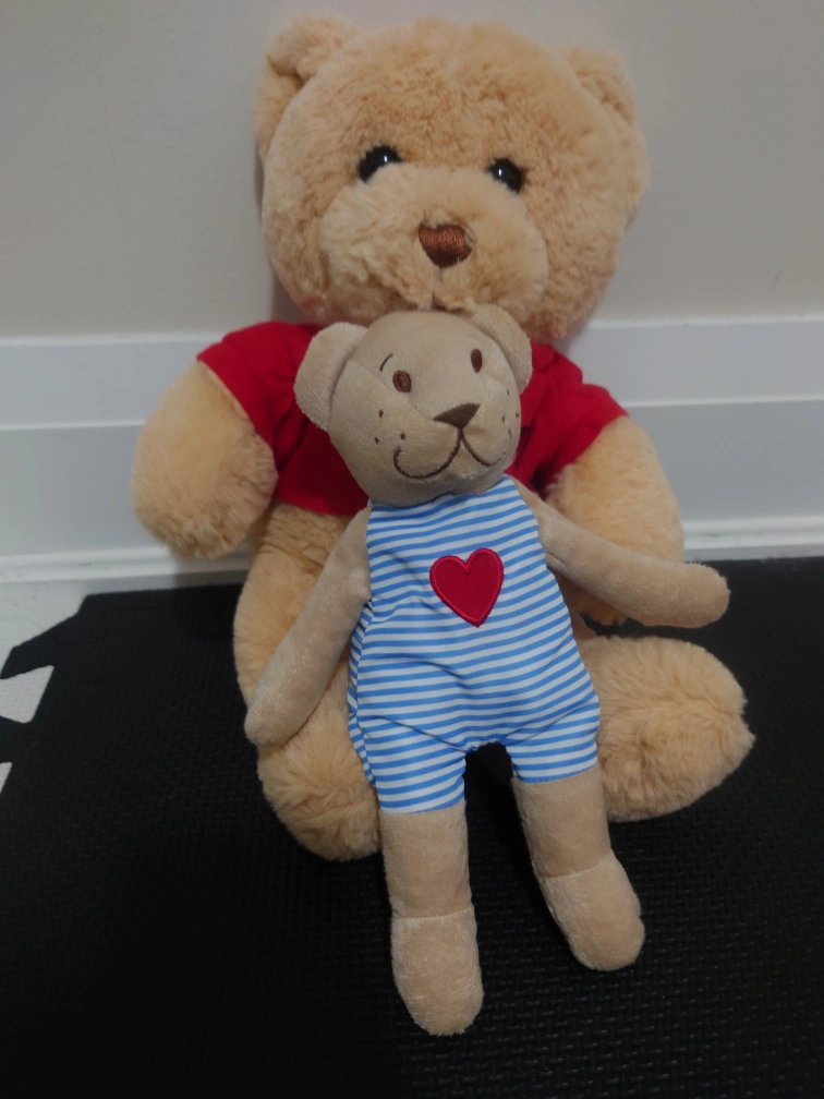 Selling two adorable plush teddy bears! One is larger and wearing a red shirt, while the smaller one is sporting a blue and white striped outfit with a cute red heart. They're both in great condition and ready for a new home!