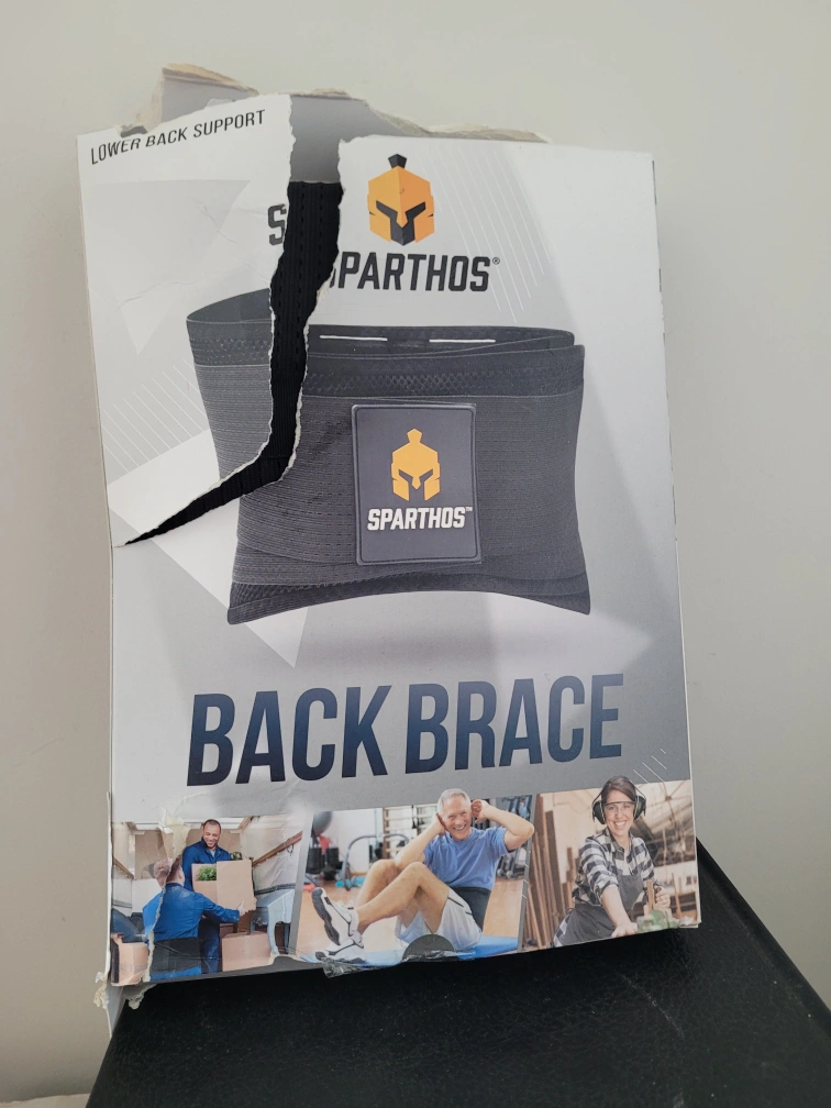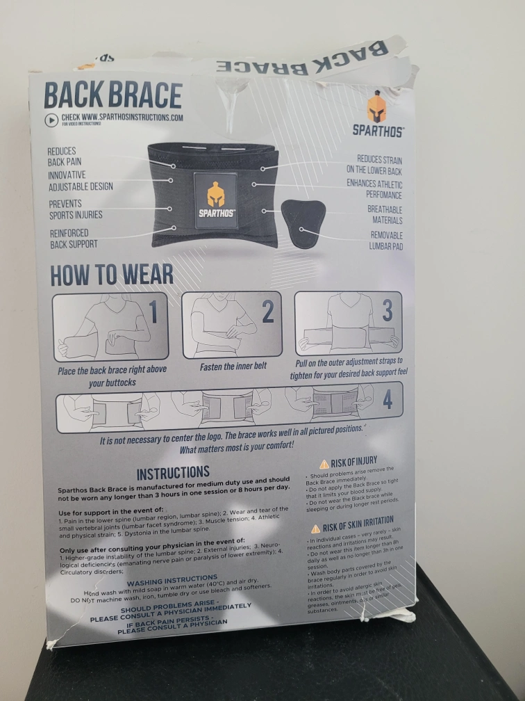 Box damaged but item new. Sparthos back brace for lower back support. It is designed to reduce strain and enhance athletic performance. The brace has breathable materials and a removable lumbar pad. Instructions on how to wear are included on the box.
