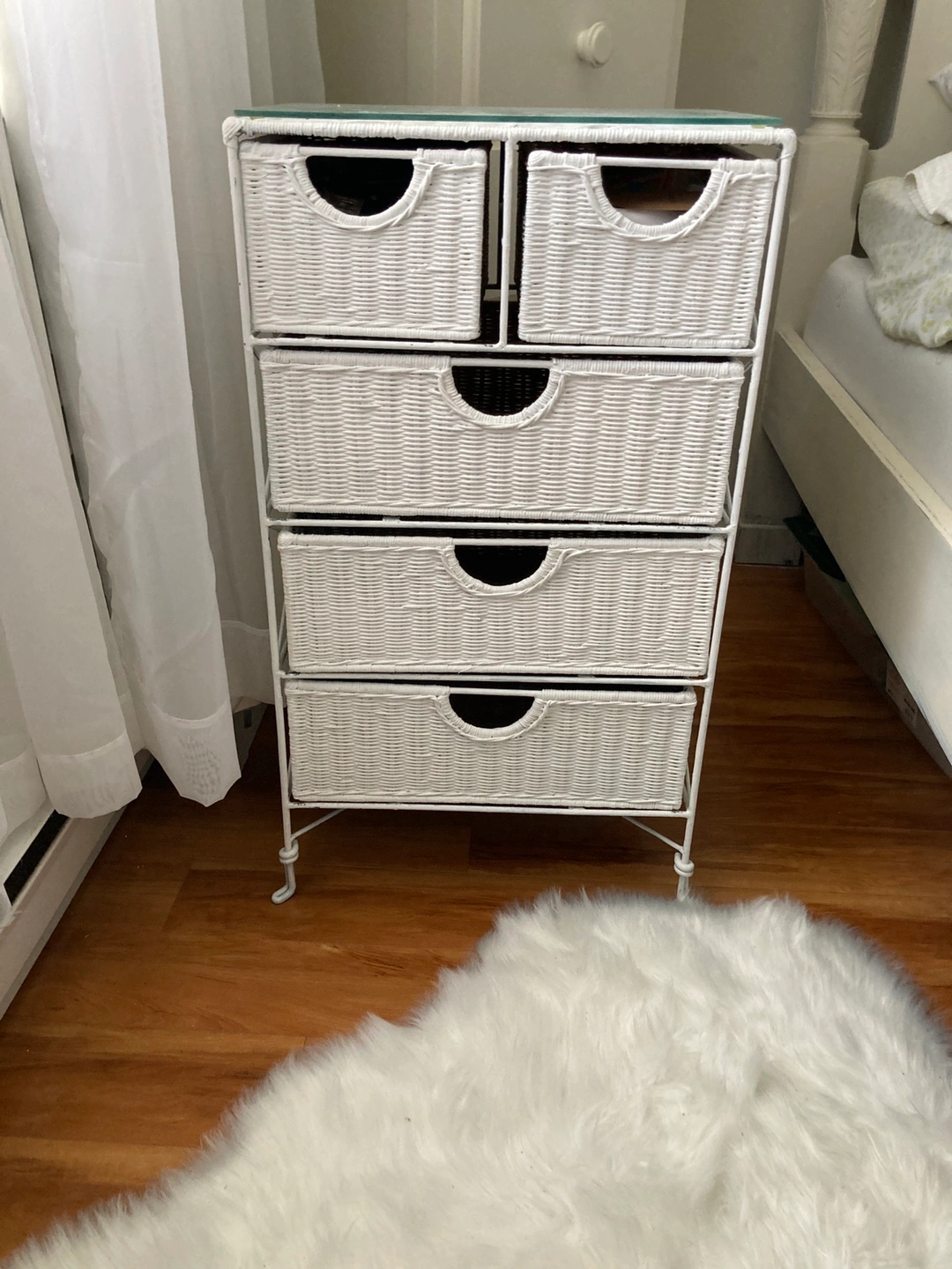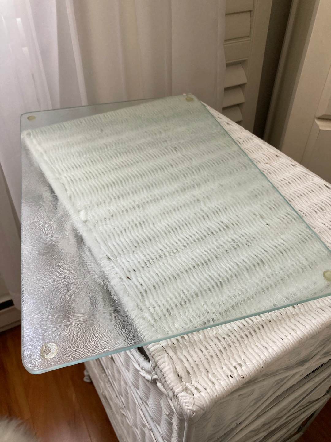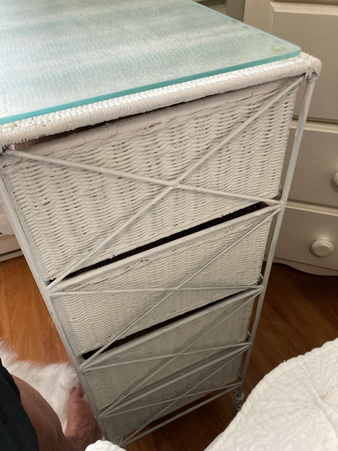 Selling a charming white wicker chest of drawers, perfect for adding a touch of cottage decor to your home. It features a clear glass top, making it both stylish and functional. This piece is in great condition and ready for a new home!