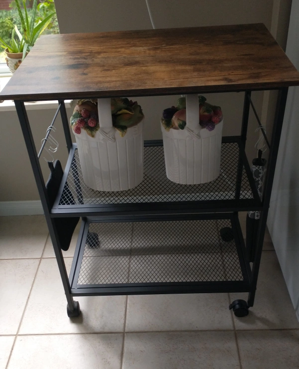 This is a kitchen island cart with a wooden top and a black metal frame. It has two mesh shelves and some hooks on the side for hanging items. The cart is on wheels, making it easy to move around your kitchen or dining area