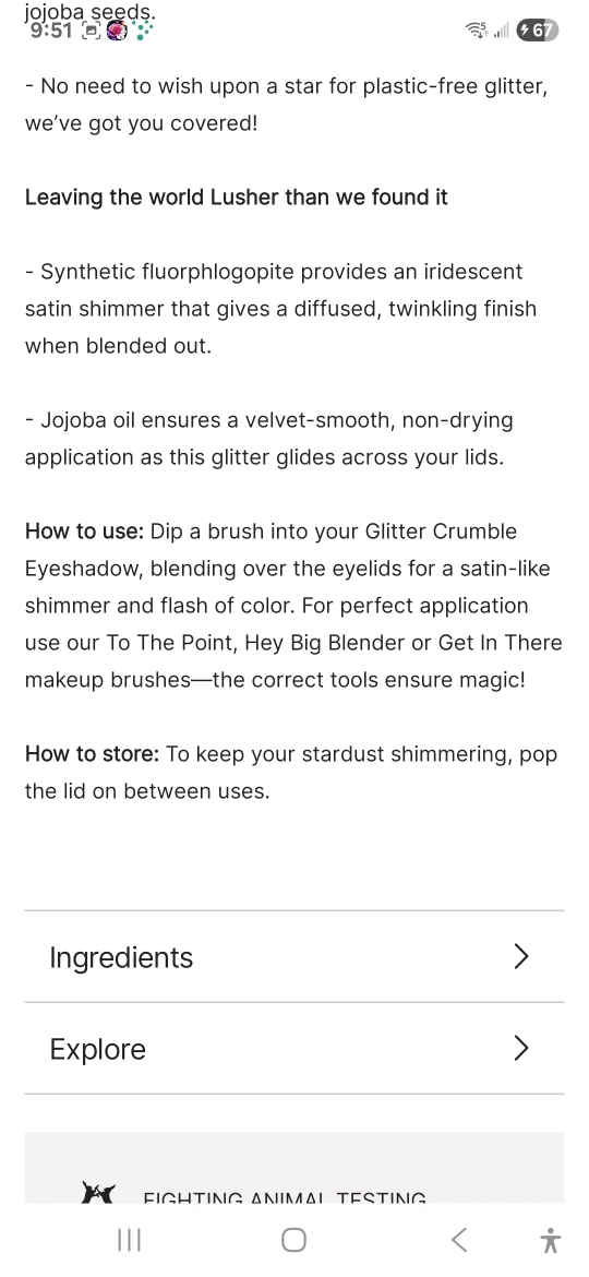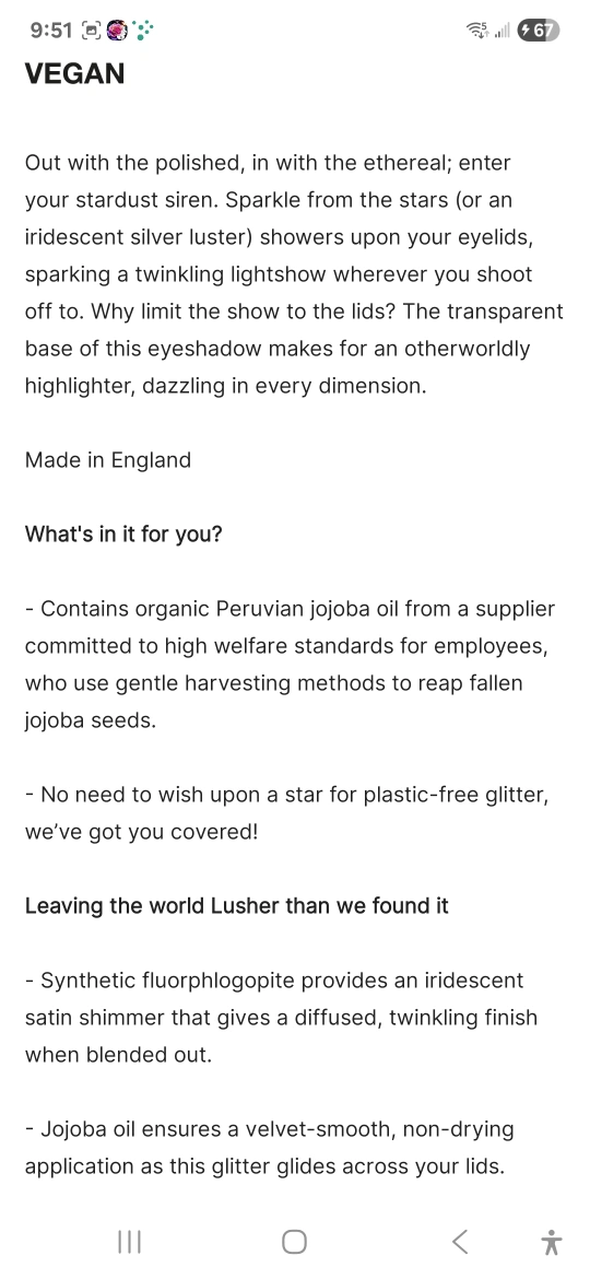 Selling a 4g pot of Lush's New Moon Glitter Crumble eyeshadow! It's a beautiful, ethereal highlighter that gives a diffused, twinkling finish when blended out. Made with organic Peruvian jojoba oil, it ensures a velvet-smooth, non-drying application. Plus, it's plastic-free glitter so you don't need to wish upon a star!