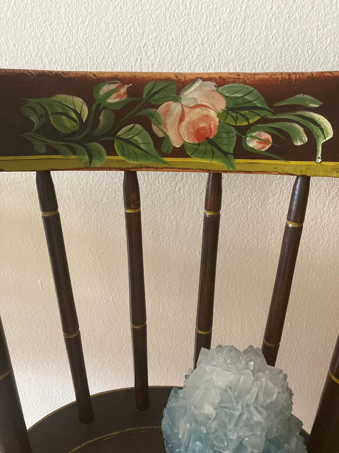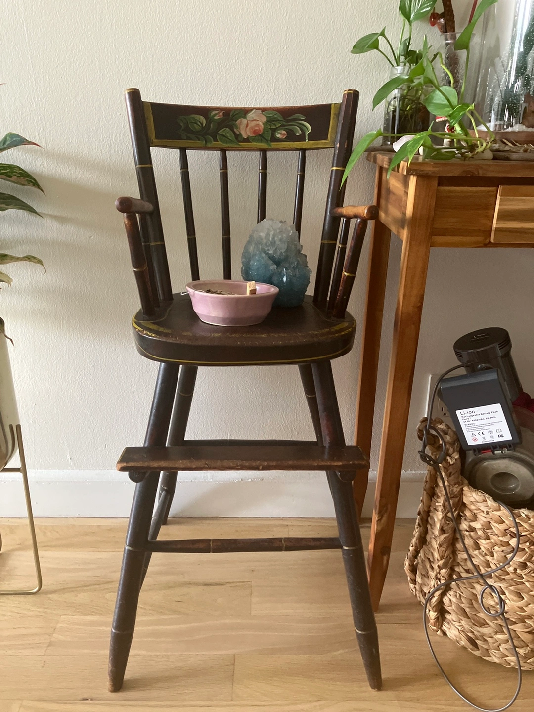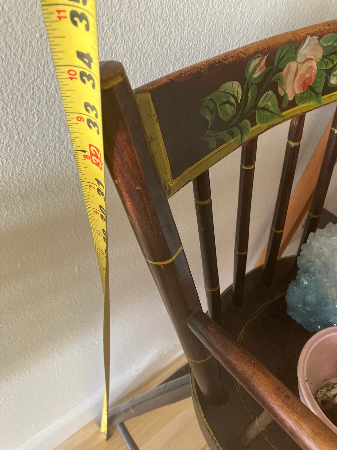 high chair with a lovely floral design painted on the backrest. The seat measures approximately 10 inches in diameter, and the chair stands about 34 inch tall from floor to the top. Pick up only.