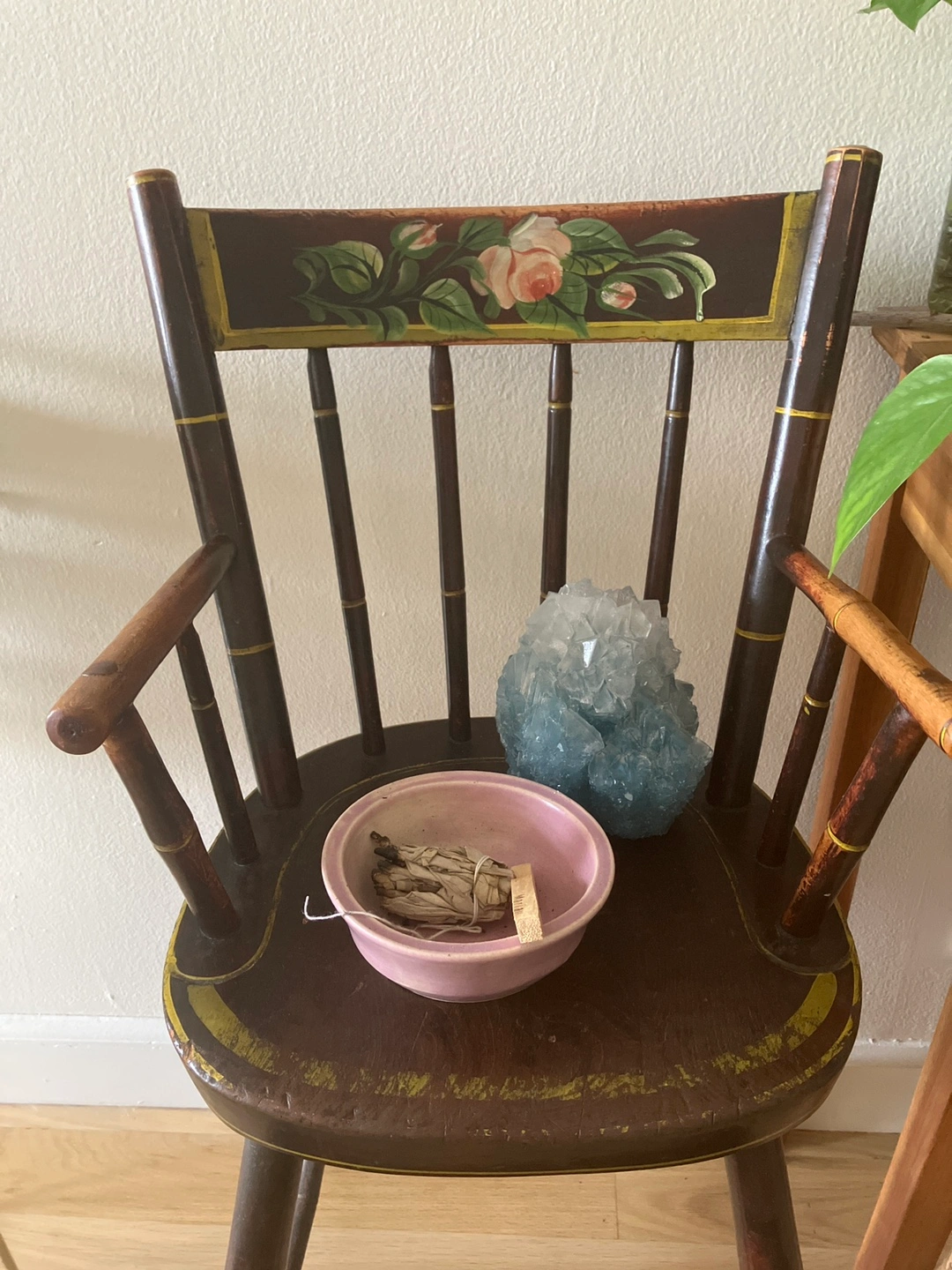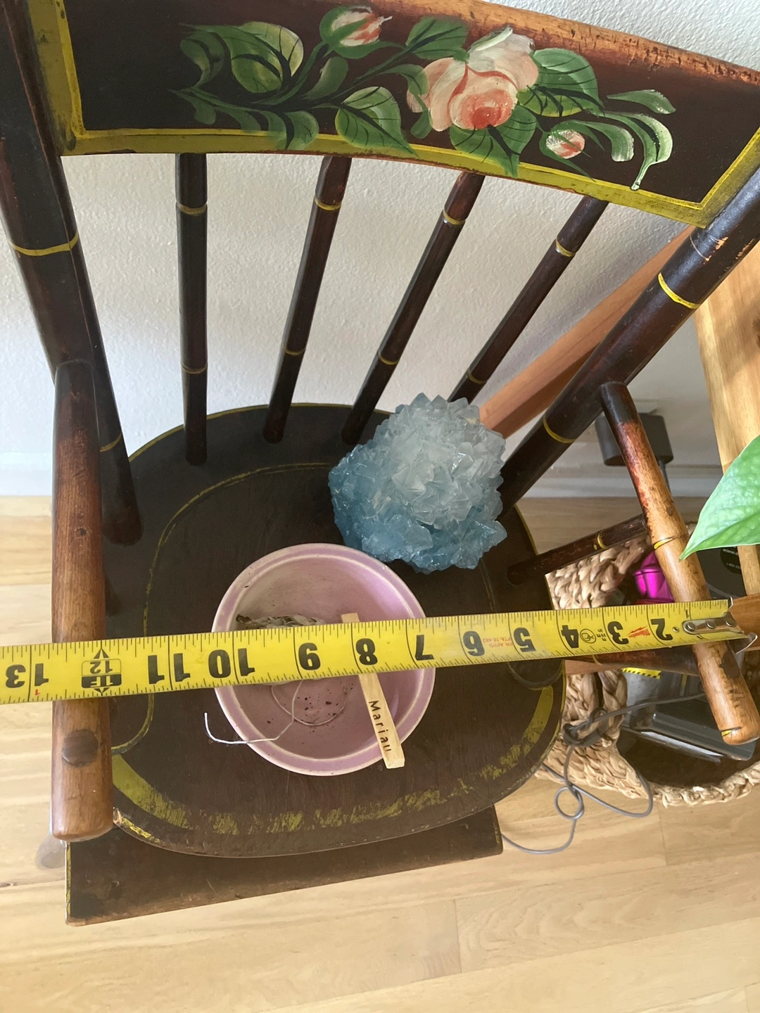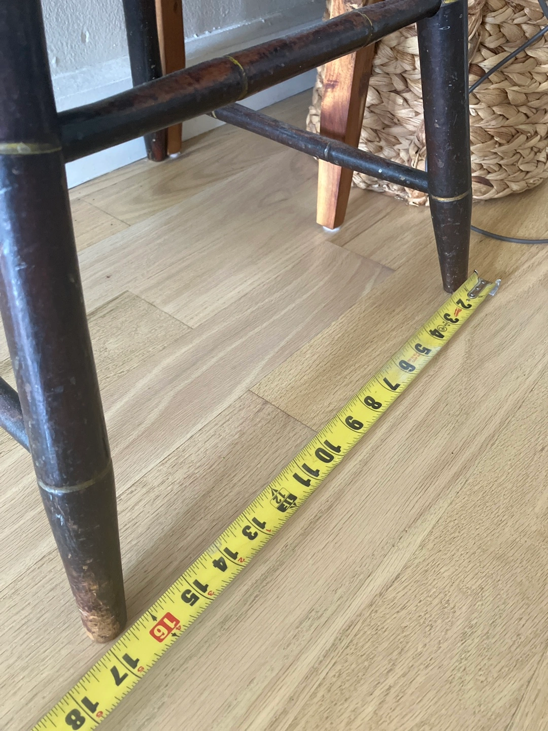 high chair with a lovely floral design painted on the backrest. The seat measures approximately 10 inches in diameter, and the chair stands about 34 inch tall from floor to the top. Pick up only.