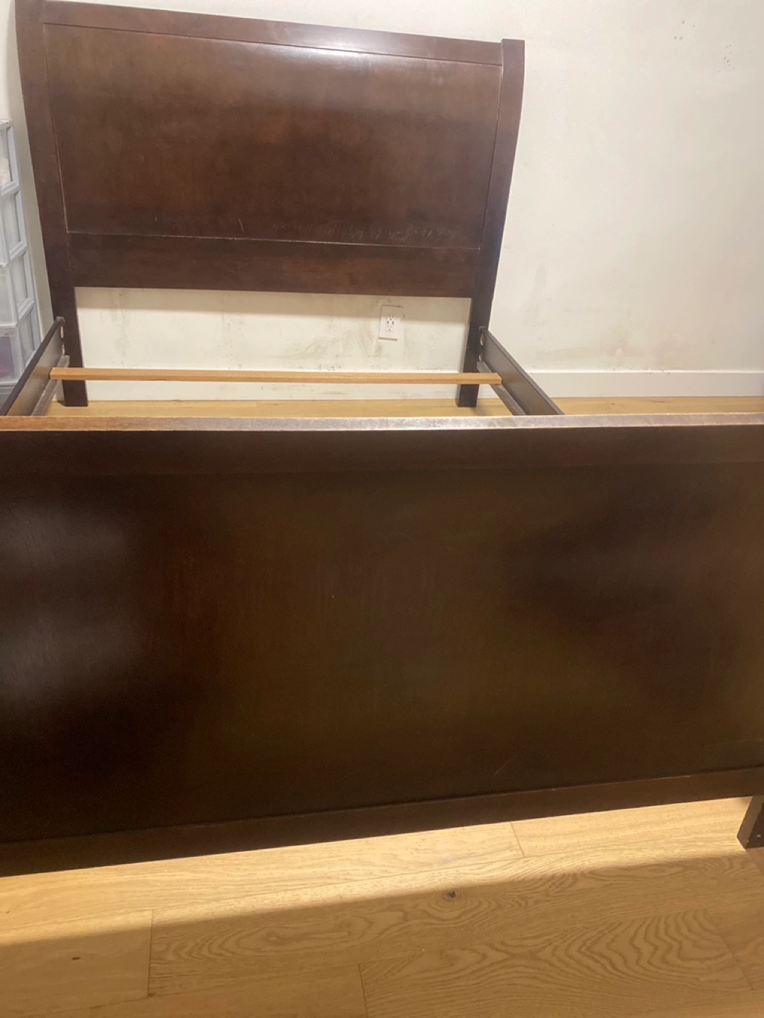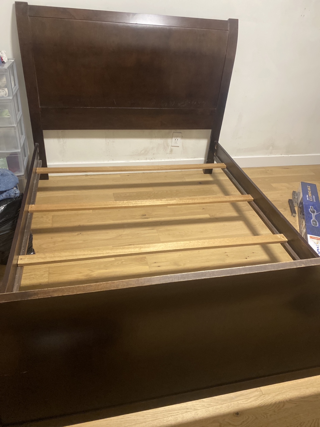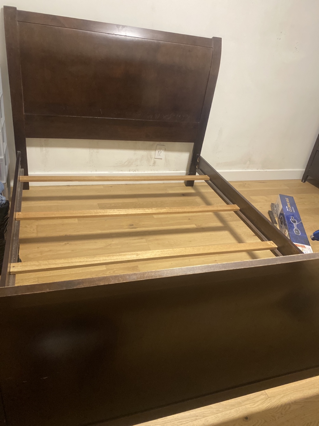 Selling a dark brown bed frame. It's in good condition and ready for a new home. Perfect for adding a touch of elegance to your bedroom!