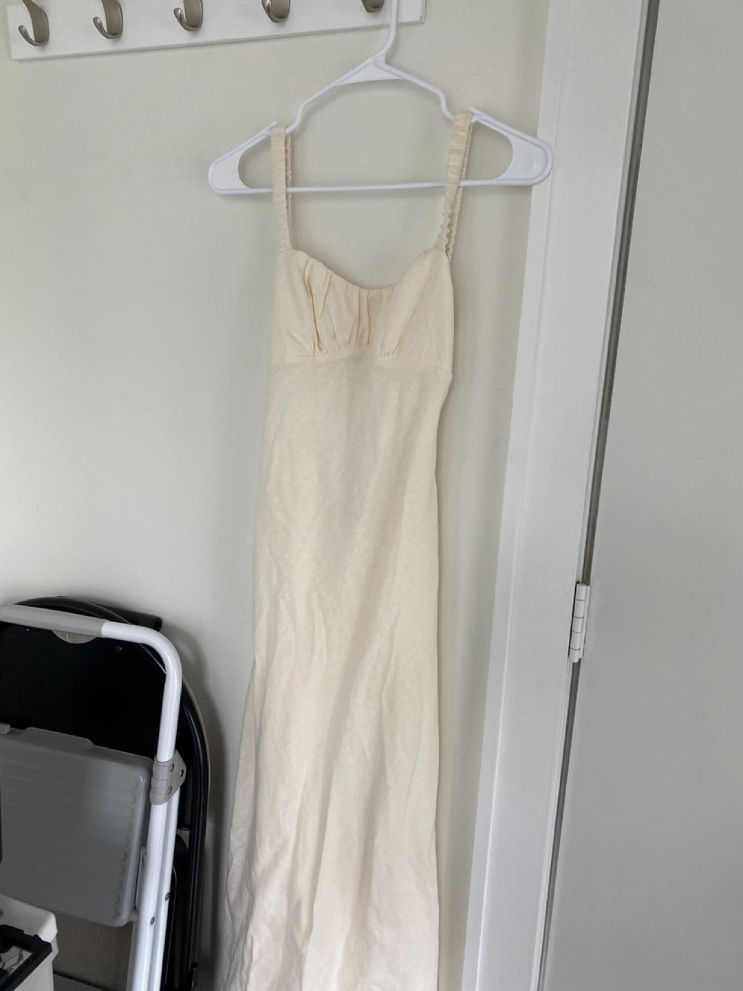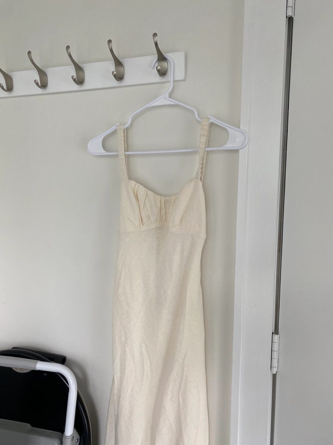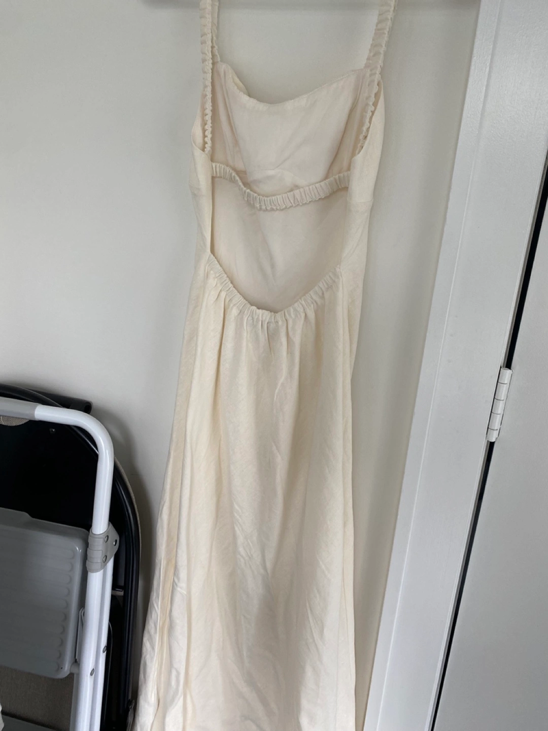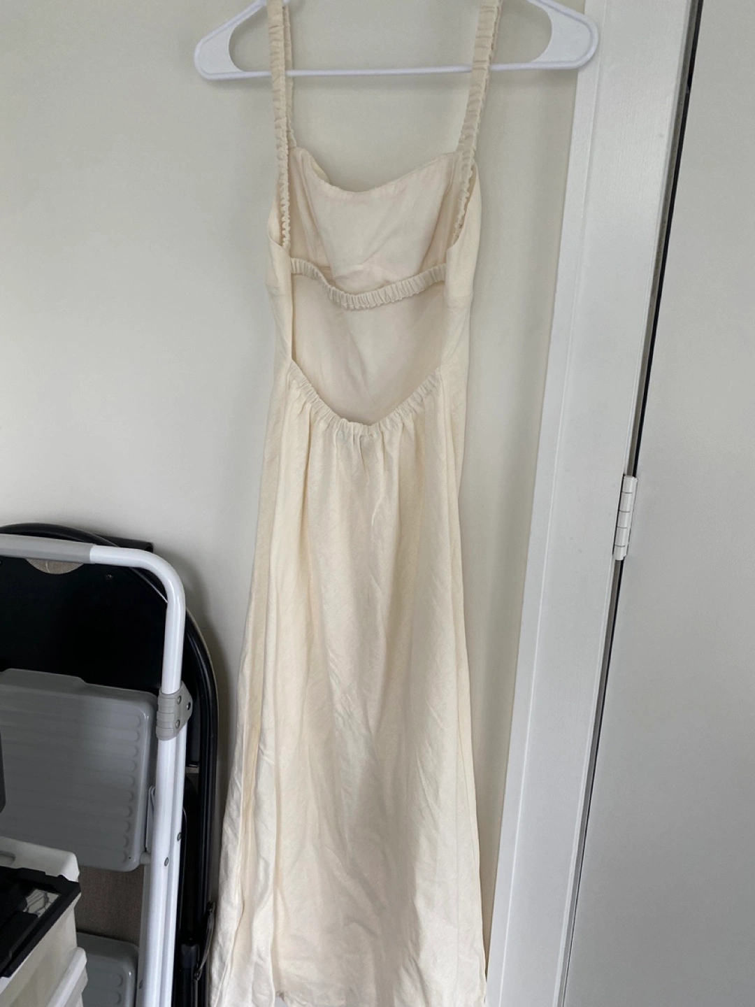 Selling a cream-coloured dress in size XXS. It's in great condition and perfect for a summer day out or a special occasion. The dress features a lovely open back design. It has been gently used and is ready for a new home