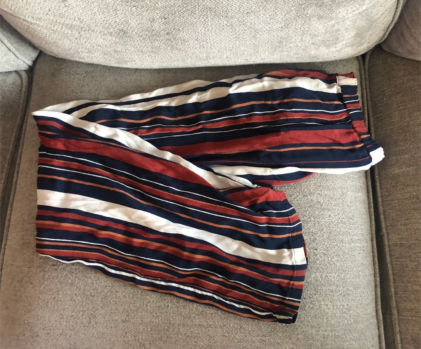 Long Tall Sally striped pants in size 4. They feature a stylish striped pattern in navy, rust, and white. Perfect for a casual or dressed-up look!
