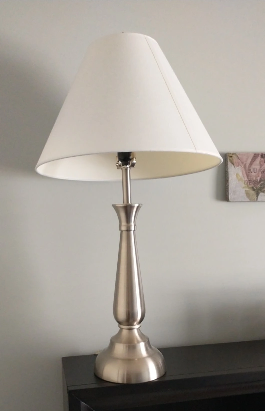 Selling a table lamp featuring a silver base and a white lampshade. It's in good condition and would look great in a living room or bedroom