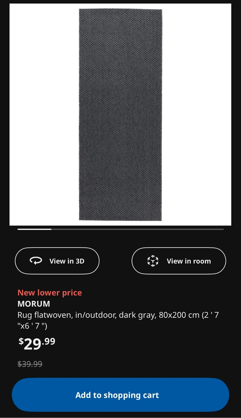 Dark gray IKEA MORUM rug. It's flatwoven and suitable for both indoor and outdoor use. The size is 80x200 cm (2'7" x 6'7"). I’ve used it for a summer on my balcony (pictured), but I’ve now changed to patio tiles and no longer need it.