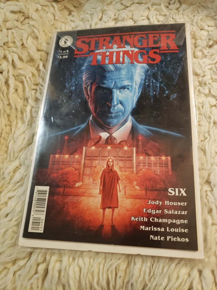 Selling a Stranger Things comic book, specifically issue 1 of 4. It's in great condition and features the story 'SIX' by Jody Houser, Edgar Salazar, Keith Champagne, Marissa Louise, and Nate Piekos. Originally priced at $3.99.