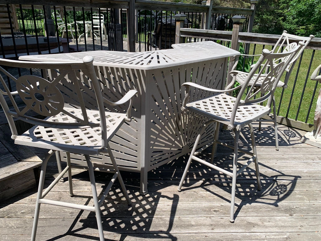 Selling an outdoor bar set that includes a bar and four chairs. The bar top measures approximately 41 inches in diameter. It's a great addition to any patio or deck!