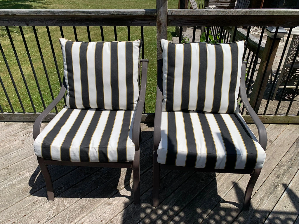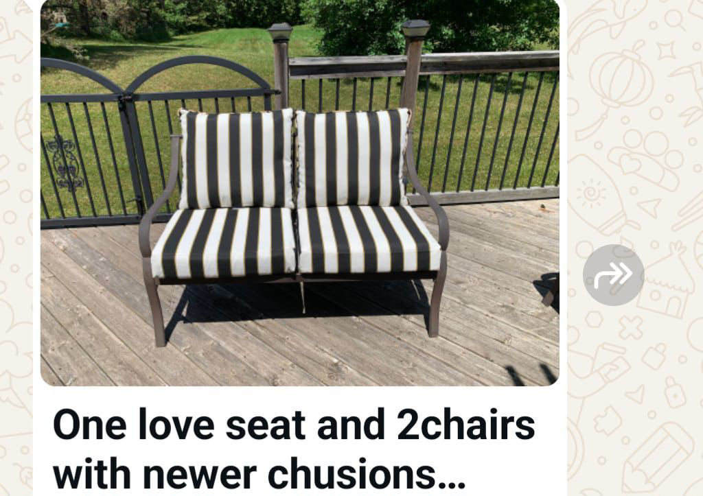 Selling a loveseat and two chairs, all with newer cushions! The cushions have a stylish black and white striped pattern, perfect for adding a touch of modern flair to your outdoor space