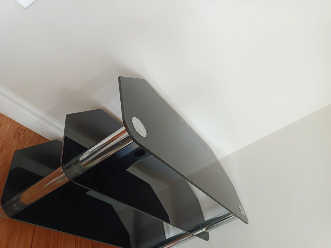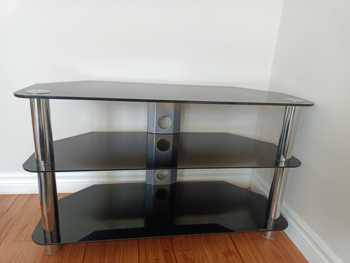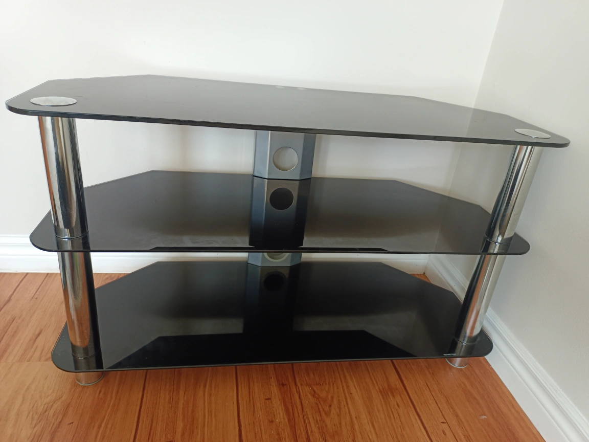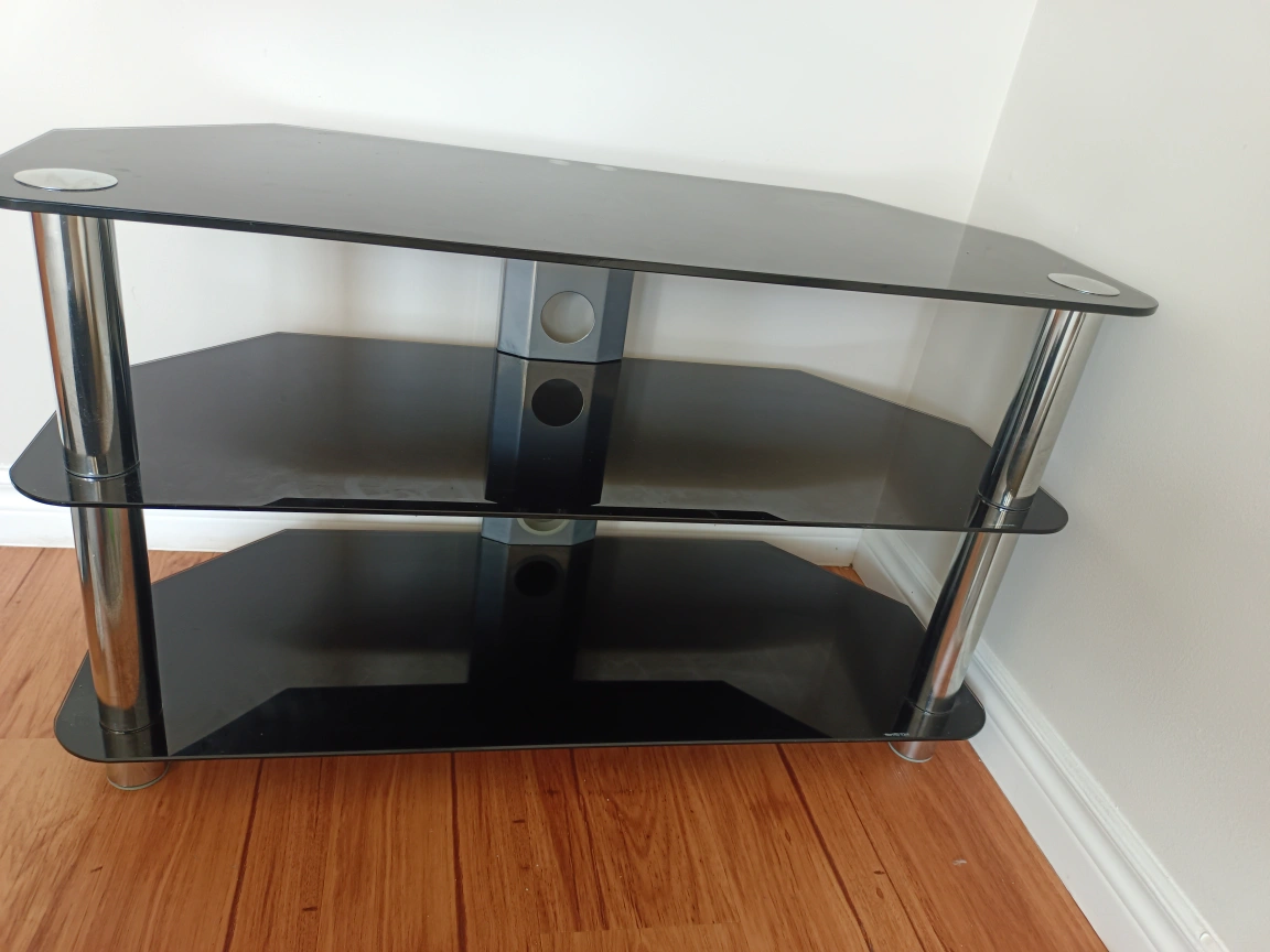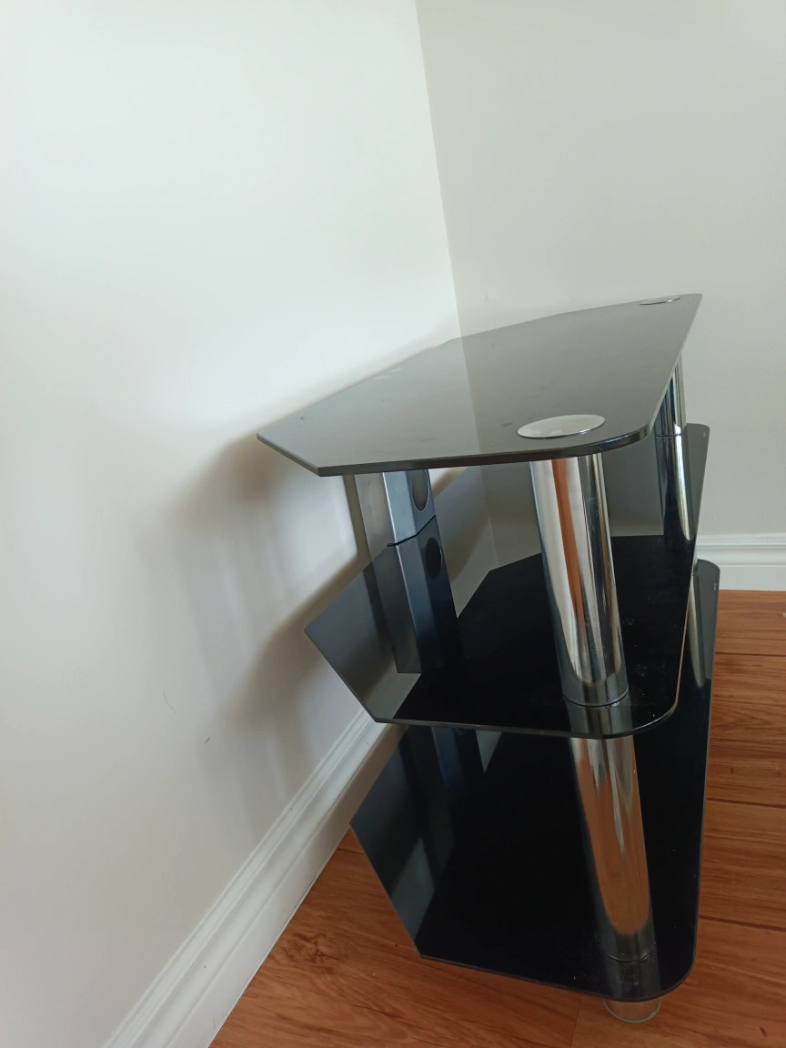 Selling a stylish black glass TV stand with chrome legs! It has three shelves, perfect for your TV and media devices. In good condition and ready for a new home