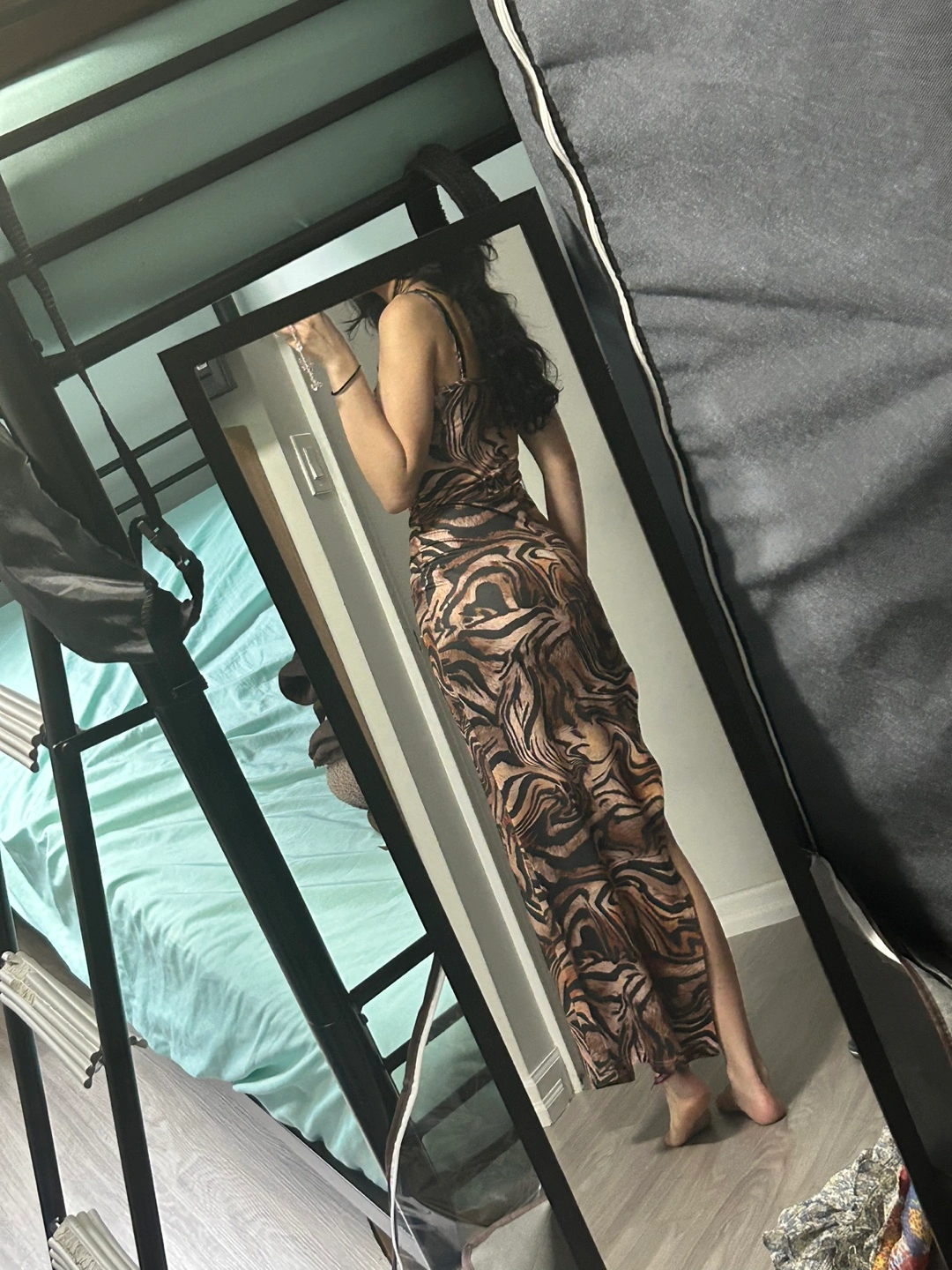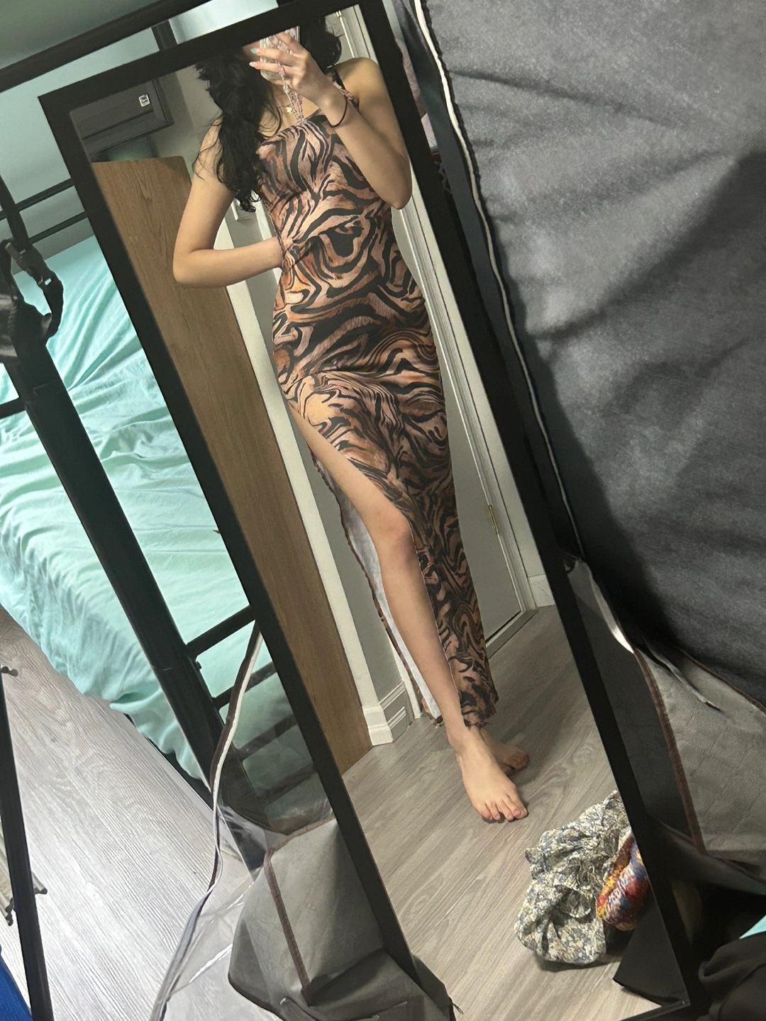 This is a tiger print maxi dress. It's in great condition and perfect for a night out or a special occasion. The dress has a flattering silhouette and a stylish design. Feel free to message me with any questions!