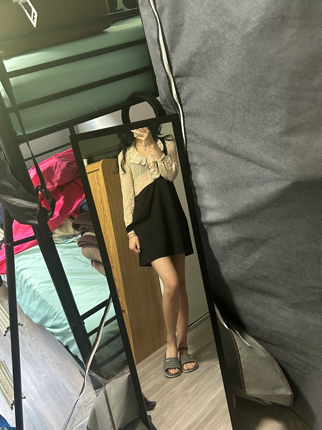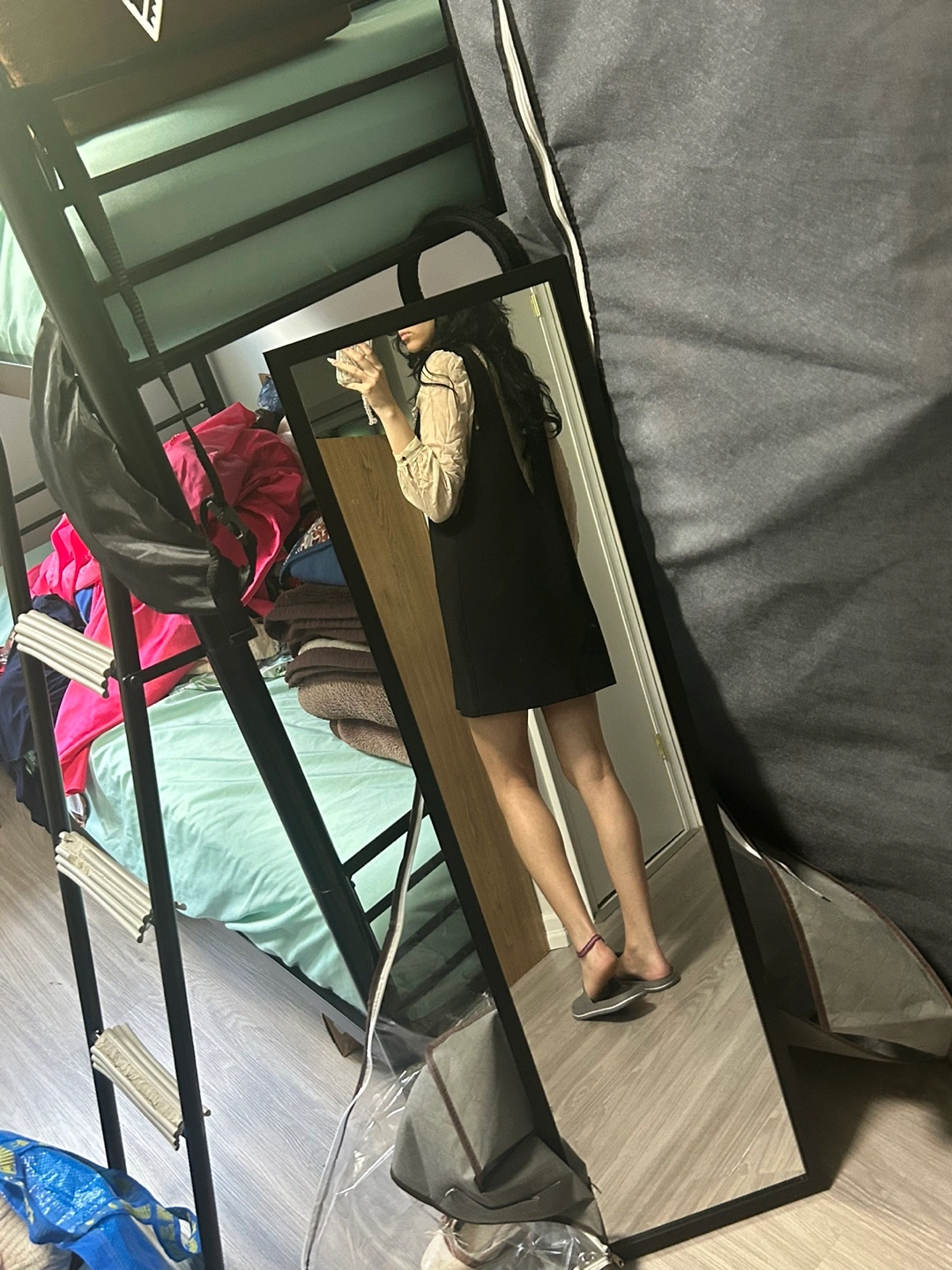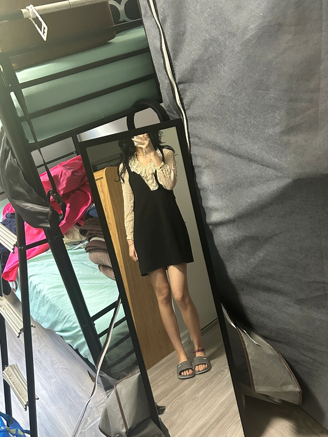 A cute black mini dress! It has a sleeveless design with a cream-coloured ruffled blouse underneath. Perfect for a night out or a casual day!