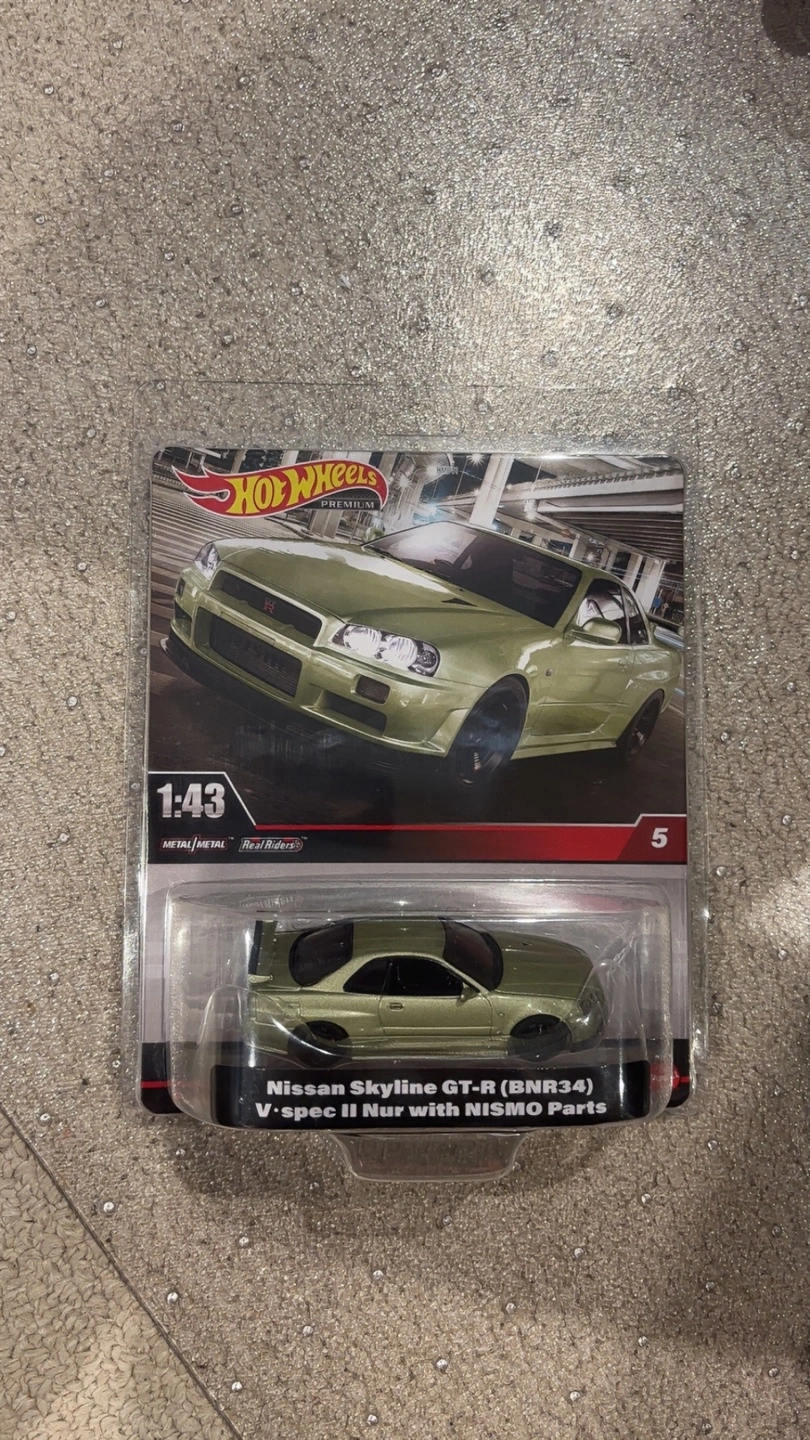 Selling a Hot Wheels Premium Nissan Skyline GT-R (BNR34) V-spec II Nur with NISMO Parts. It's a 1:43 scale diecast car with metal chassis and Real Riders tires. Trying to get rid of this ASAP $20 bucks Cash only ❗️
