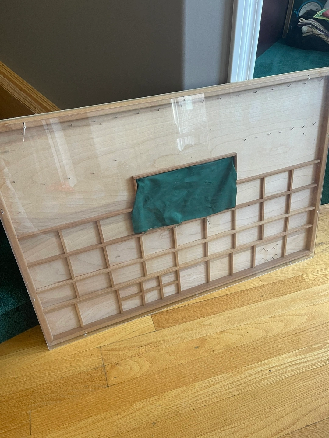 Selling a wooden display shelf. It has a natural wood finish and a grid-like structure, perfect for displaying small items or collectibles. It could also be repurposed as a shadow box or decorative piece. The shelf has a green fabric accent on the back, great for special pins .
