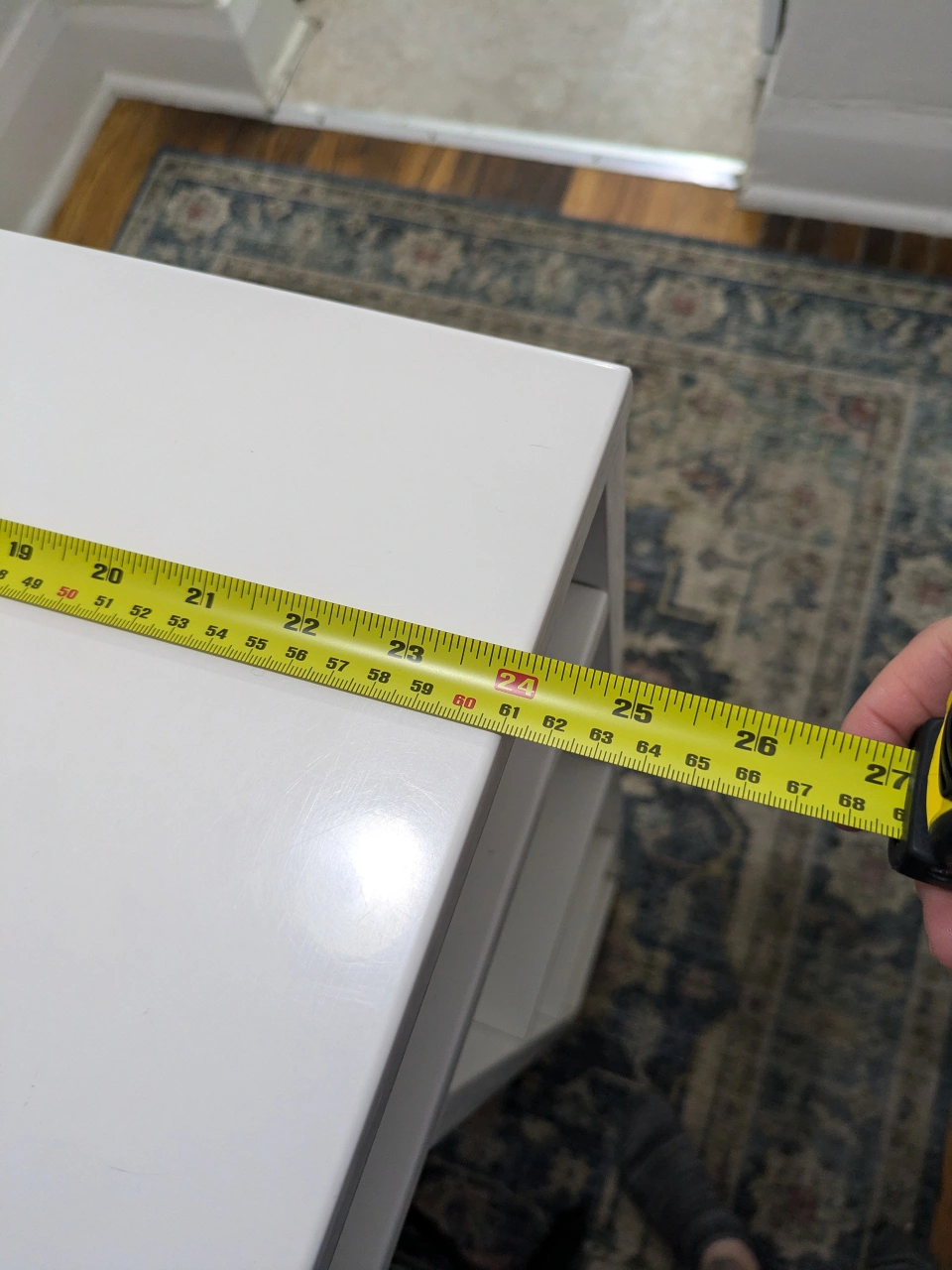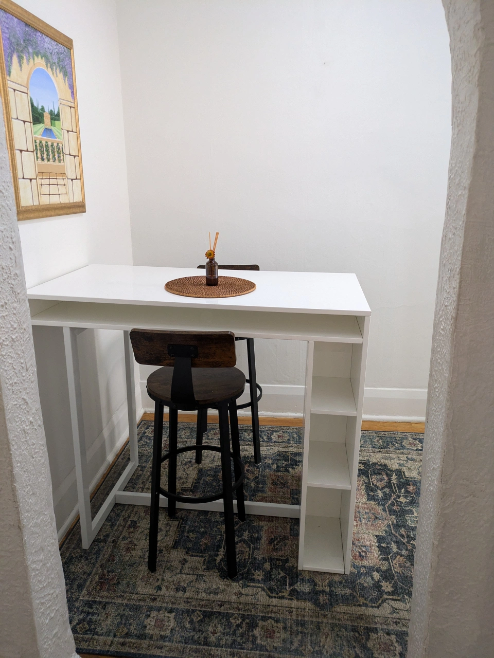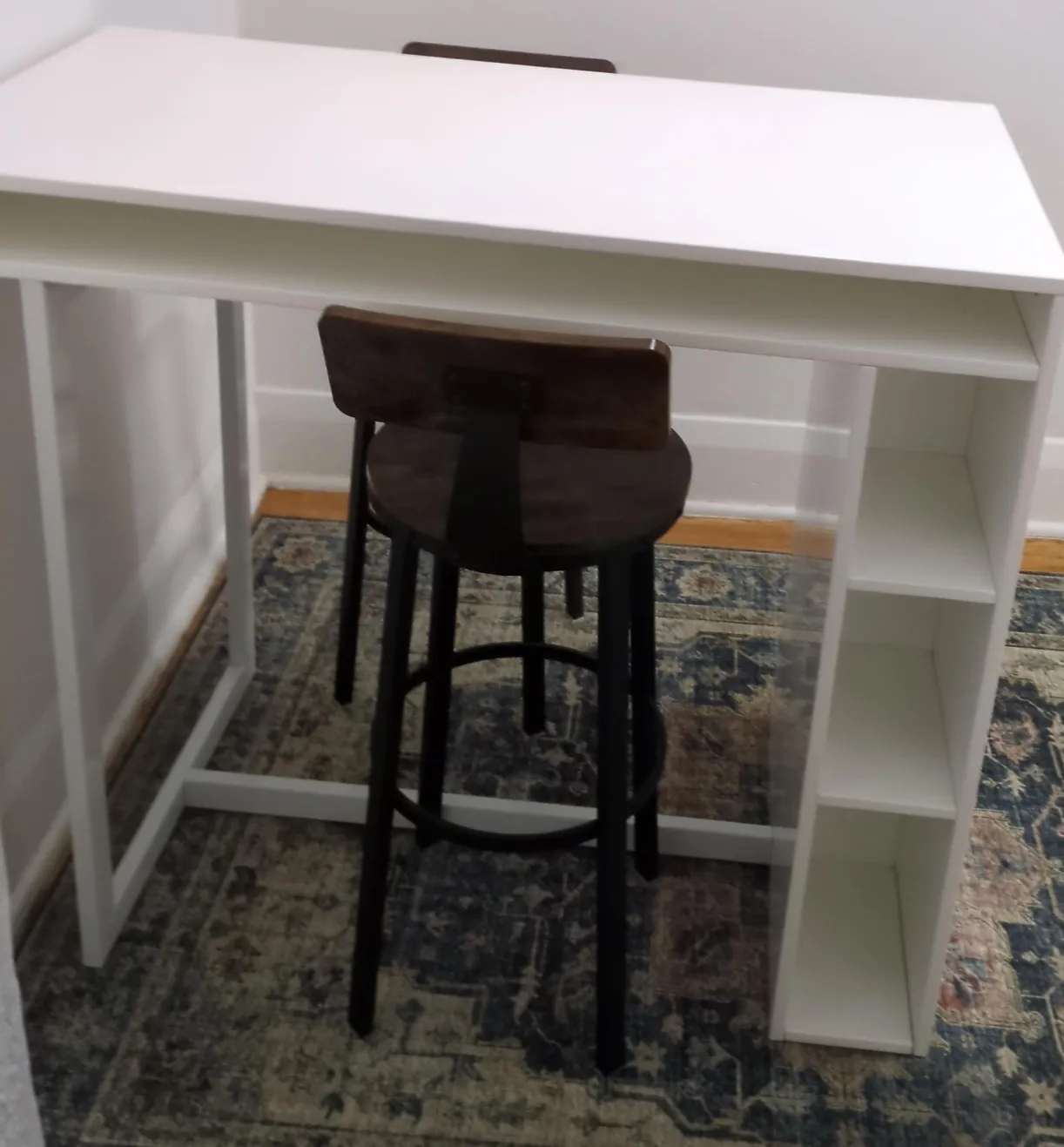 The table is white and features built-in storage shelves under the table top and on one side; I put all my dinnerware, glassware, utensils and tupperware in this and it all fit great!
